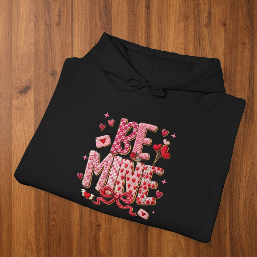 Slide into a hoodie that feels like a quiet, confident love note. This mid-weight hoodie carries a soft, hand-drawn “Be Mine” crochet motif in playful pinks and reds at chest-level, with a tiny crochet heart accent on the sleeve — subtle romance without shouting. The roomy kangaroo pocket and double-lined hood make it an easy go-to for chilly evenings, late-night walks, or cozy movie nights. It settles into your routine: layered over a tee for coffee runs, pulled on for a slow Sunday, or worn while wrapping a thoughtful surprise for someone you care about. The look is casual, warm, and sincere — like wearing a little charm that says exactly what you mean.