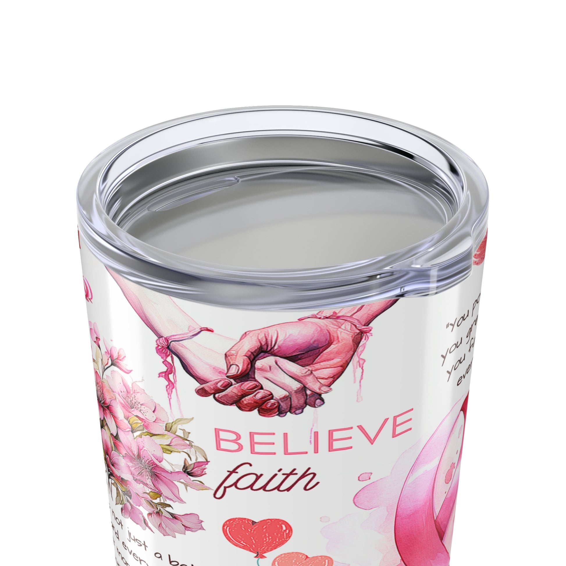 Carry inspiration with you wherever you go with this 20oz white tumbler from the Breast Cancer Awareness Collection. Wrapped in an uplifting pink graphic design, it’s filled with powerful words like victory, resilience, and strength, alongside the iconic pink ribbon, hearts, flowers, and delicate feathers. Both functional and meaningful, this tumbler keeps your drinks at the perfect temperature while serving as a daily reminder of hope, courage, and support.