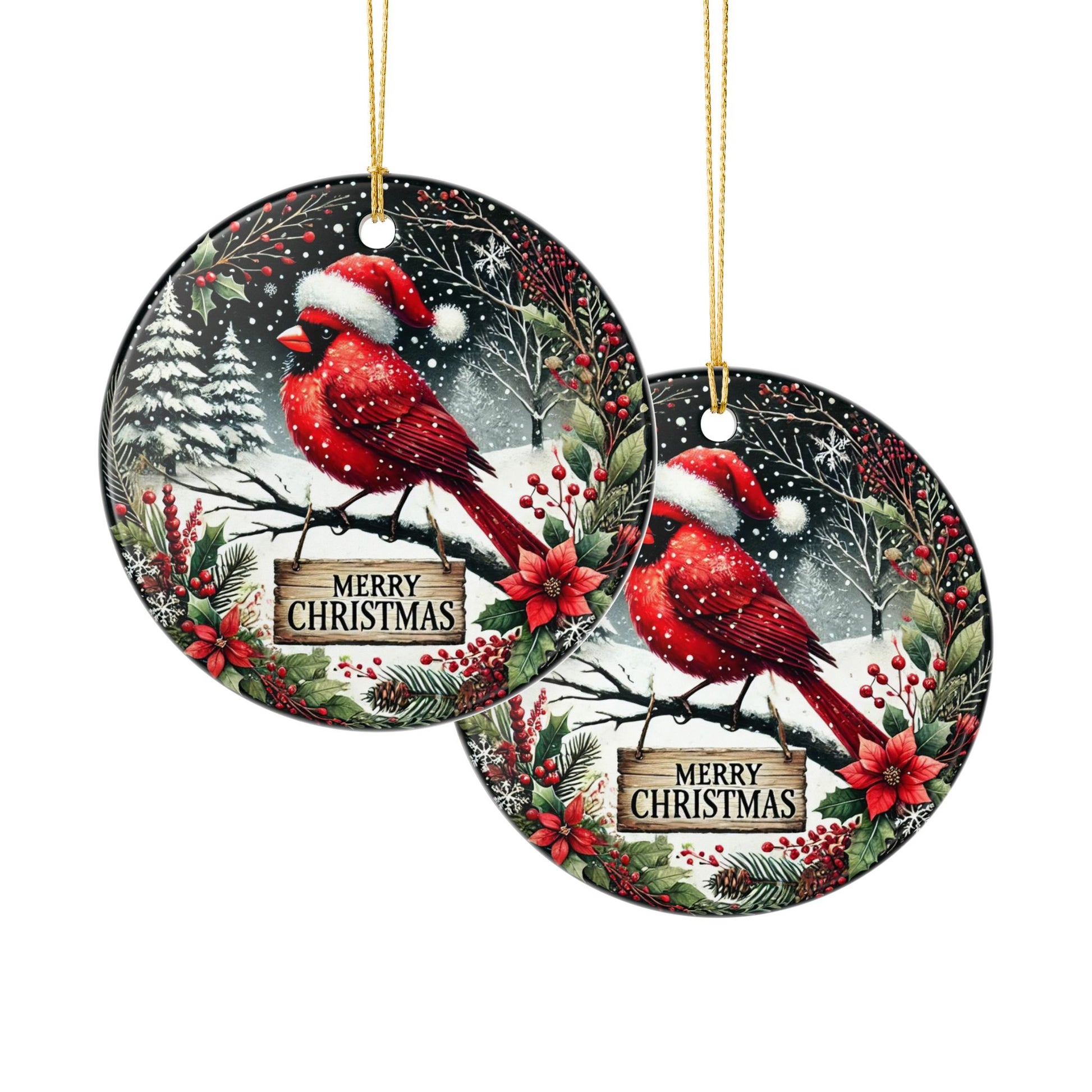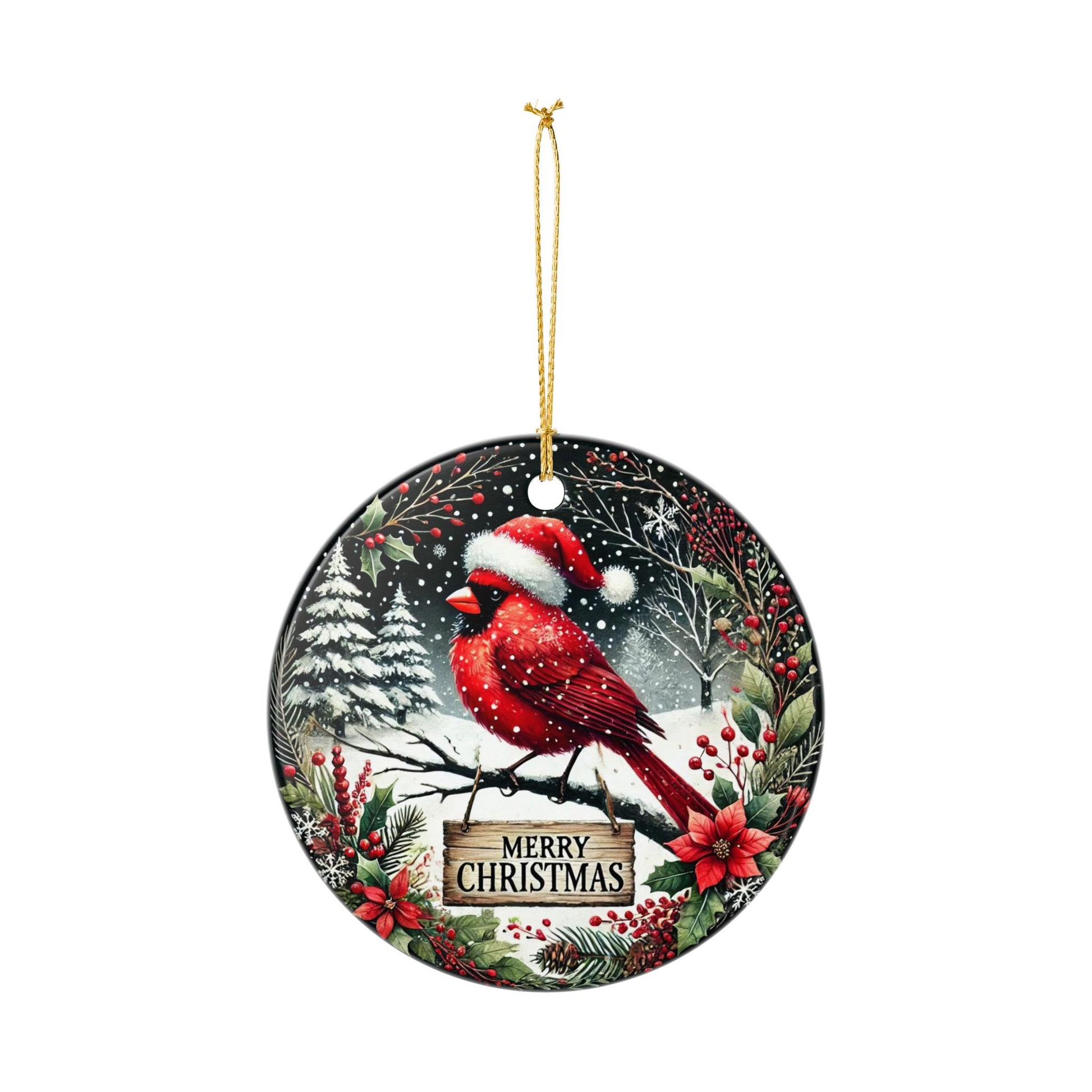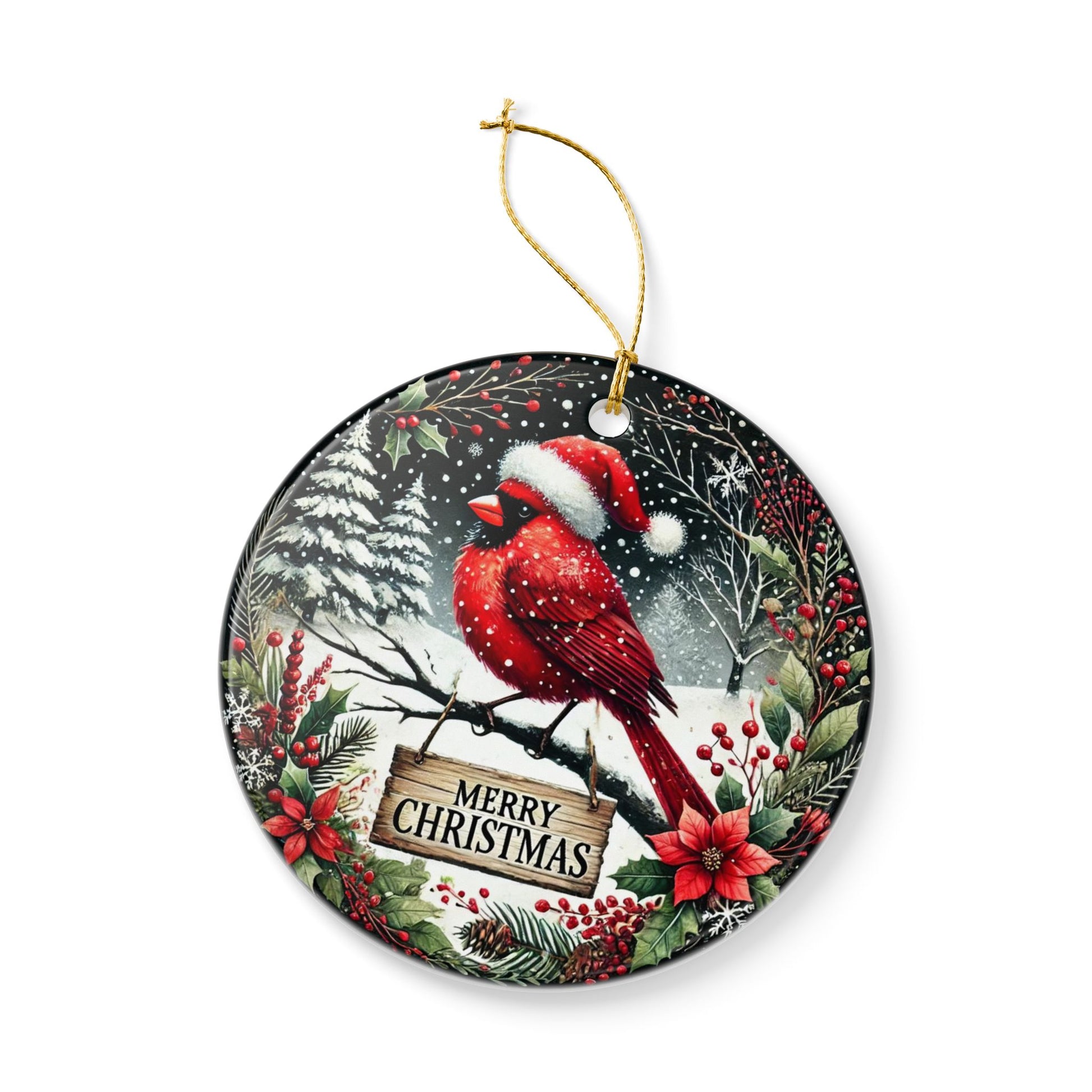 A joyful symbol of hope and warmth, Cardinal Cheer captures the heart of Christmas in a single, vibrant moment. This beautiful ornament features a bright red cardinal in a Santa hat perched among snow-dusted evergreens, holly, and poinsettias — all framed by a classic Merry Christmas sign.