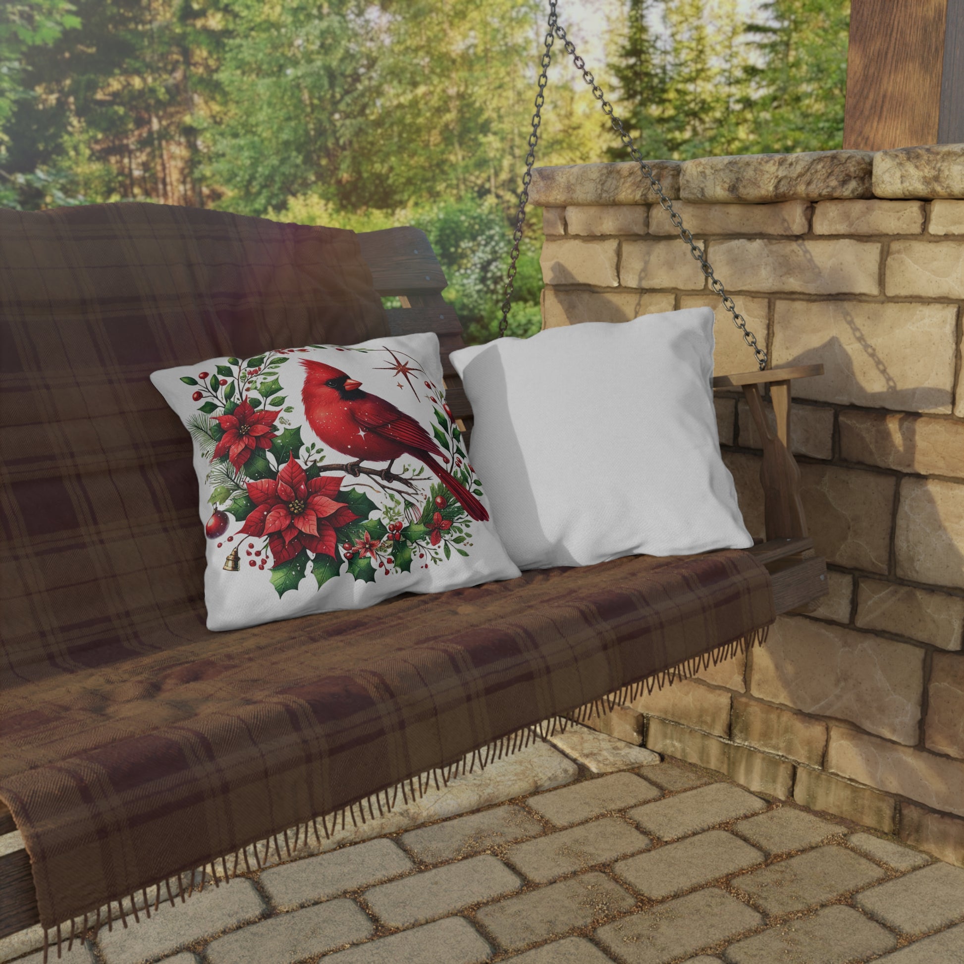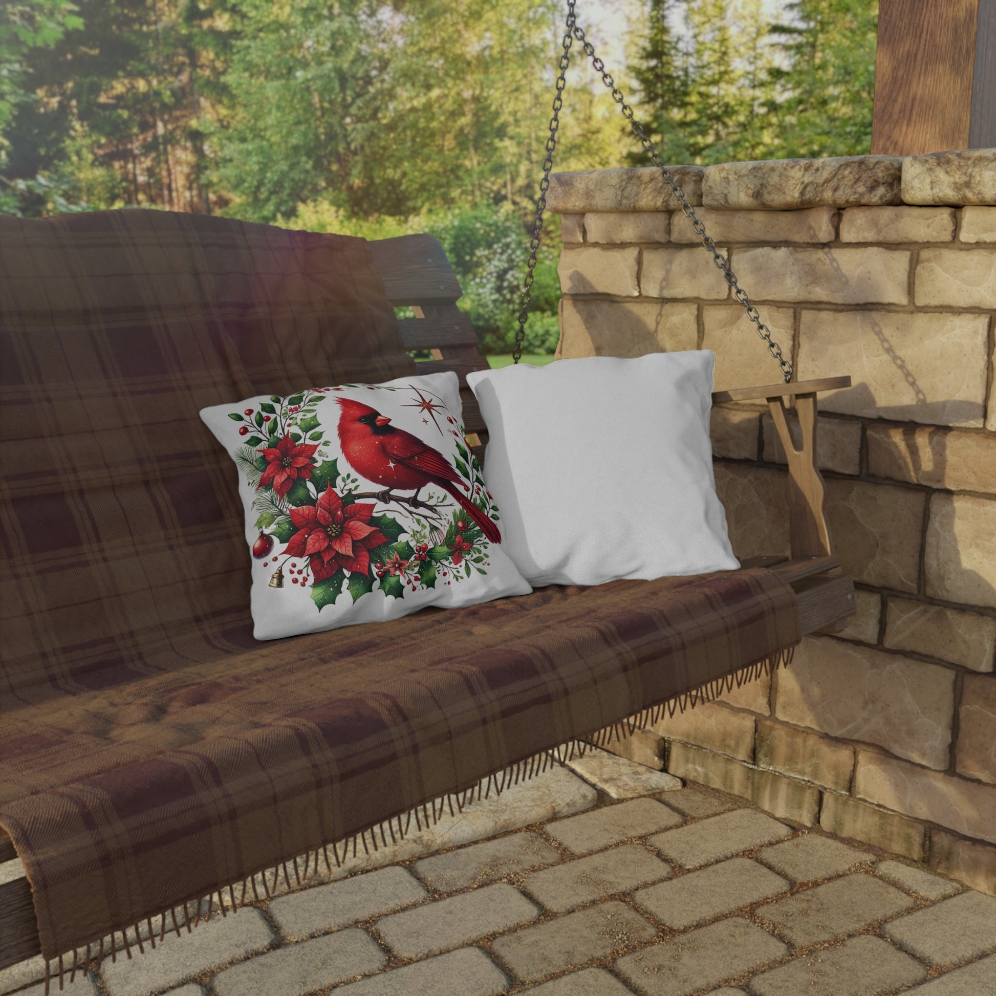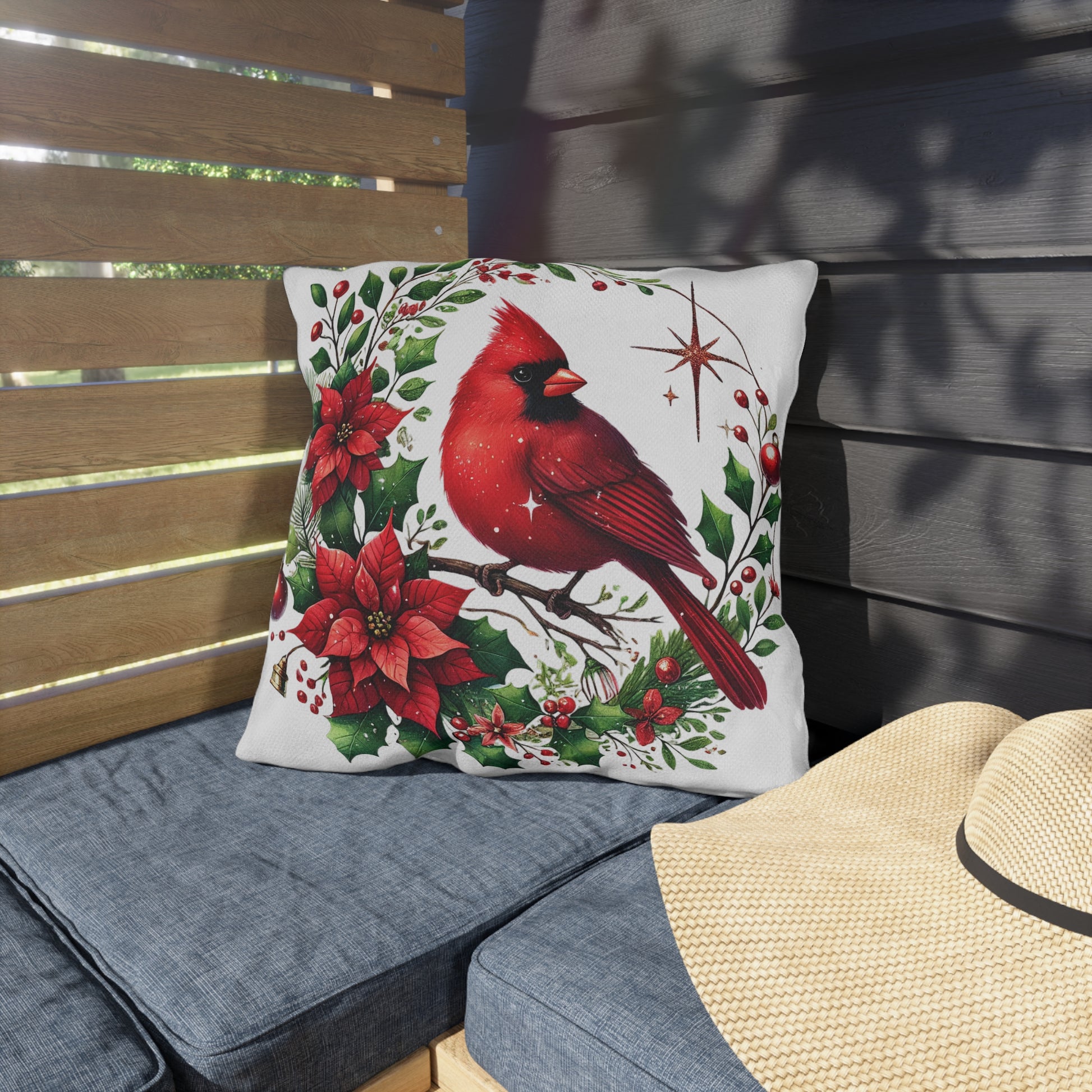 Celebrate the beauty of the holiday season with our Cardinal & Poinsettia Outdoor Pillow. This charming design features a brilliant red cardinal perched among poinsettias, holly, and berries—a heartwarming symbol of peace, hope, and Christmas cheer.