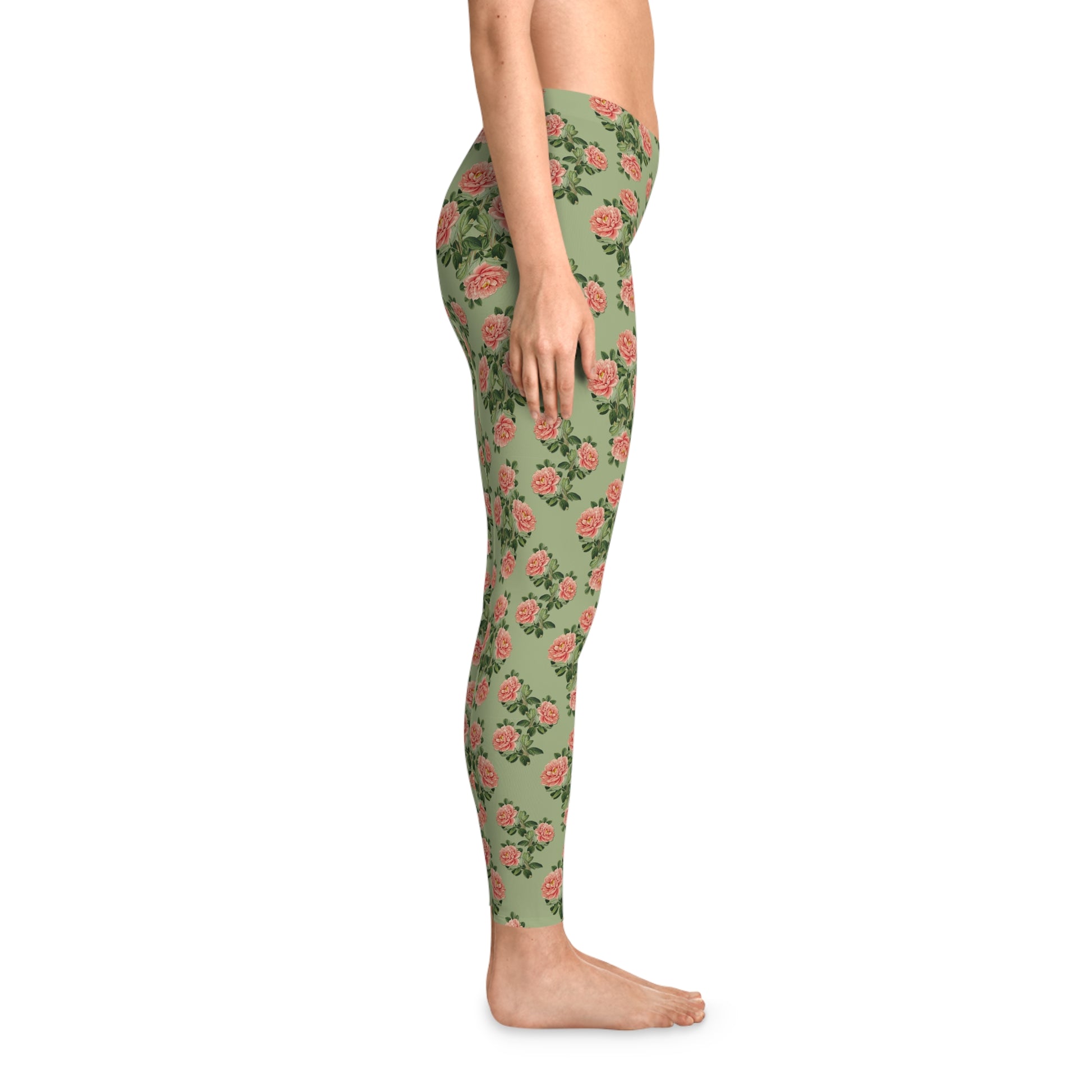 These ankle-length leggings bring a garden-fresh mood to everyday wear. Softly stretchy fabric drapes close to the body, letting the vintage rose pattern bloom across a muted sage background. They move with you—yoga flow, running errands, or curled up with tea—while the mid-rise, thin elastic waistband keeps a smooth silhouette. The seam-minimized construction and medium-weight knit make them comfortable year-round without feeling bulky. Subtle sewn-in labeling and careful assembly in the USA add thoughtful finishing touches.