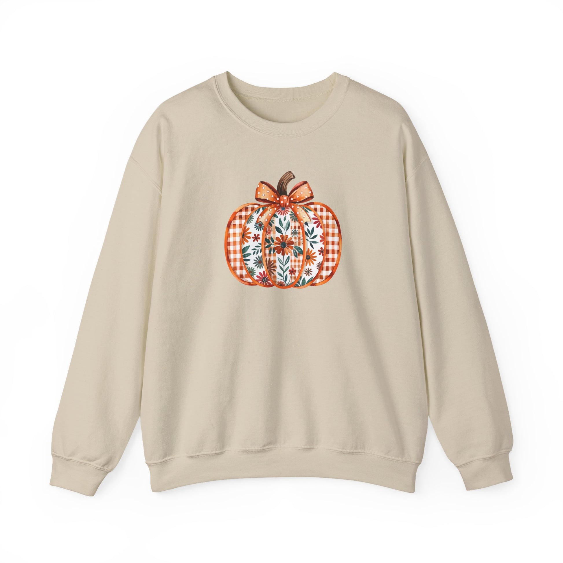 Wrap yourself in autumn charm with this soft tan sweatshirt featuring a beautifully designed quilted-style pumpkin. The pumpkin is divided into five sections with a mix of orange-and-white checks and delicate fall floral patterns, all set against a white background. A sweet orange ribbon tied around the stem adds the perfect finishing touch.