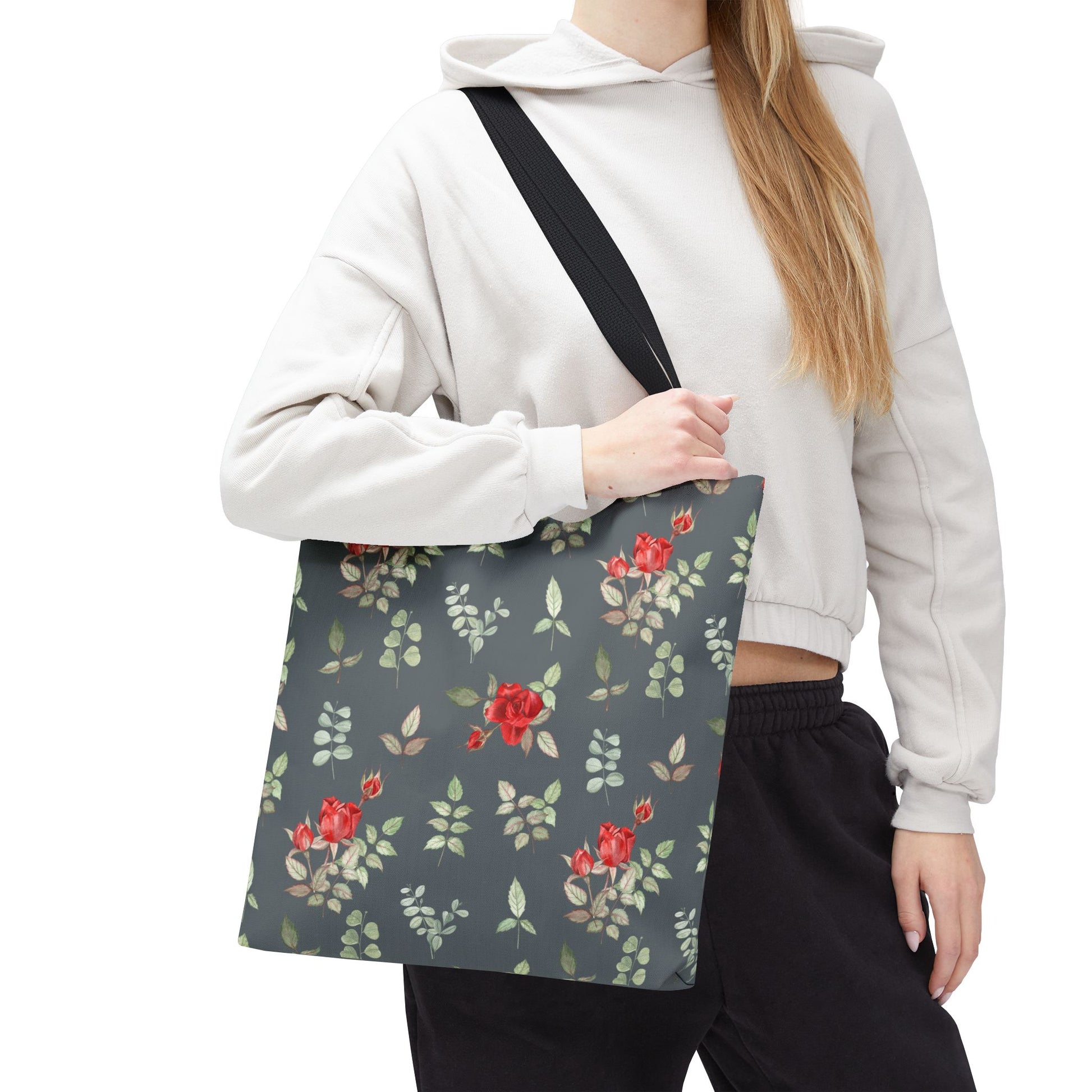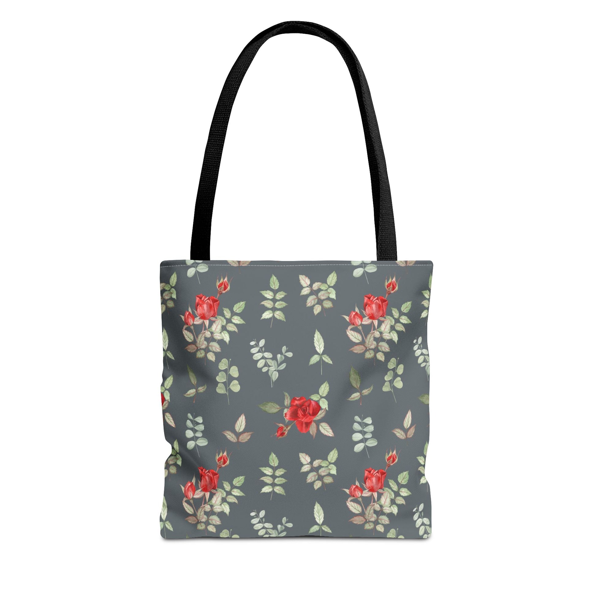 A soft-structured everyday tote that carries a quiet, vintage garden vibe. The muted slate background cushions scattered sprigs of pale greenery and small painterly red roses, so the print reads like a tucked-away bouquet rather than a loud pattern. It slips over the shoulder easily and holds its shape thanks to a medium-weight polyester body and boxed corners, so it stays tidy whether you’re running errands, visiting markets, or carrying notebooks to a café. The black inner stitching and choice of handle colors let you customize the look, while reinforced seams and a laminated interior keep things from sagging or leaking. This is a companion bag for slow mornings, market days, and strolls where you want a little floral charm without shouting for attention.