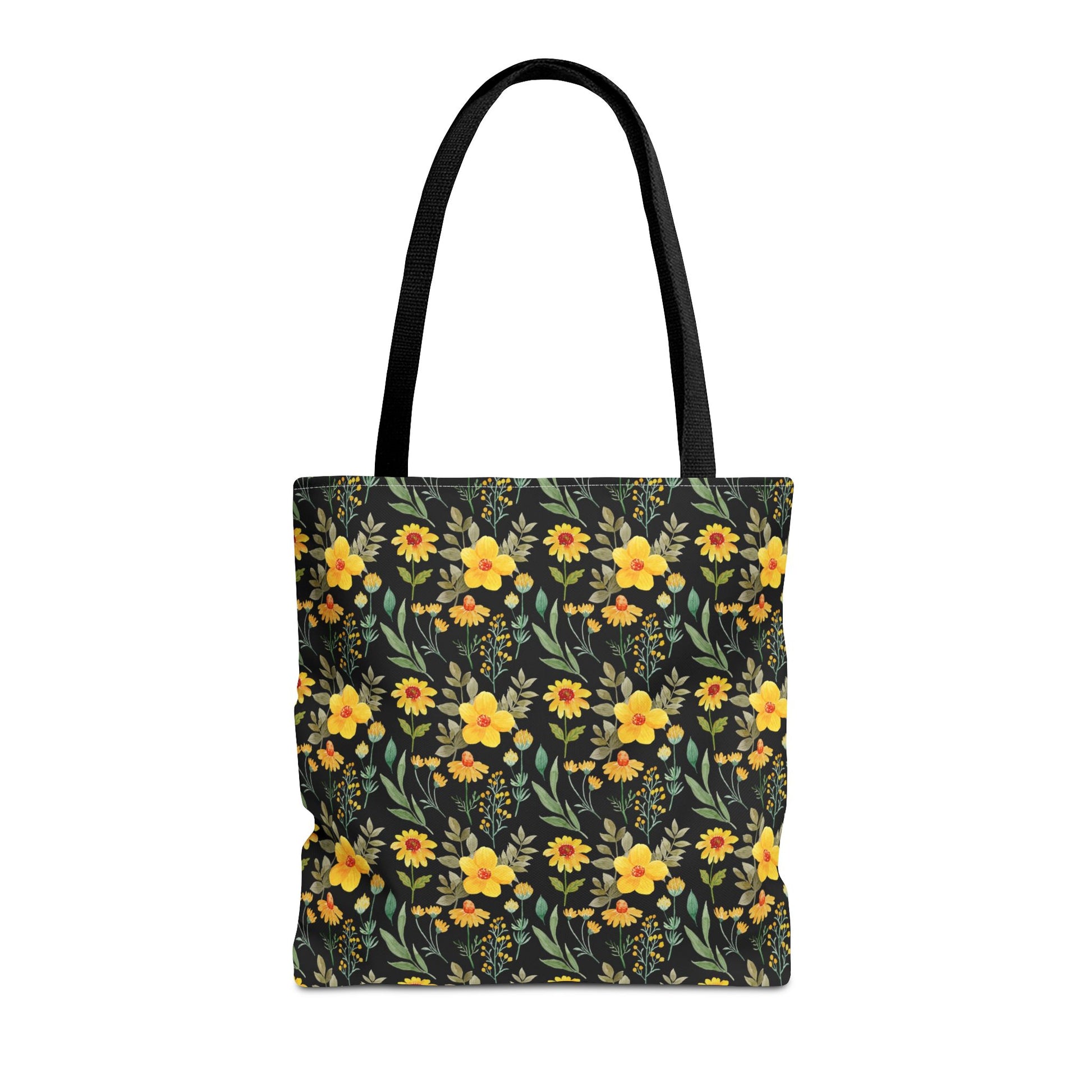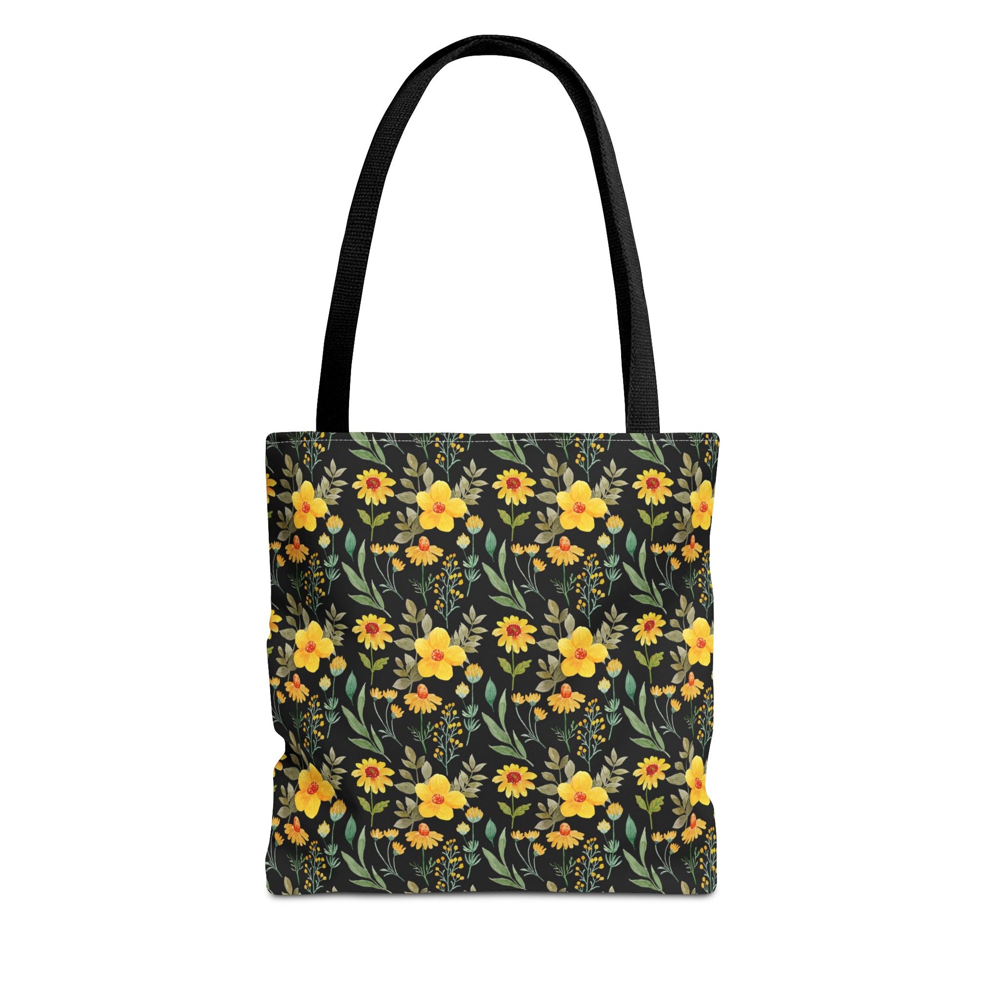 This medium-weight polyester tote carries a warm field of hand-painted yellow blooms on a deep charcoal background — cheerful yet understated. The roomy boxed-corner body holds groceries, sketchbooks, or market finds without losing its shape thanks to reinforced handles and durable fabric. Inside, a non-woven laminate adds structure and helps items stay neat. Choose from five handle colors to match your style; the black-strap option shown gives a sleek, modern contrast to the vintage-inspired floral. Comfortable to sling over a shoulder, it moves from weekday errands to weekend picnics with an easy, lived-in feel.
