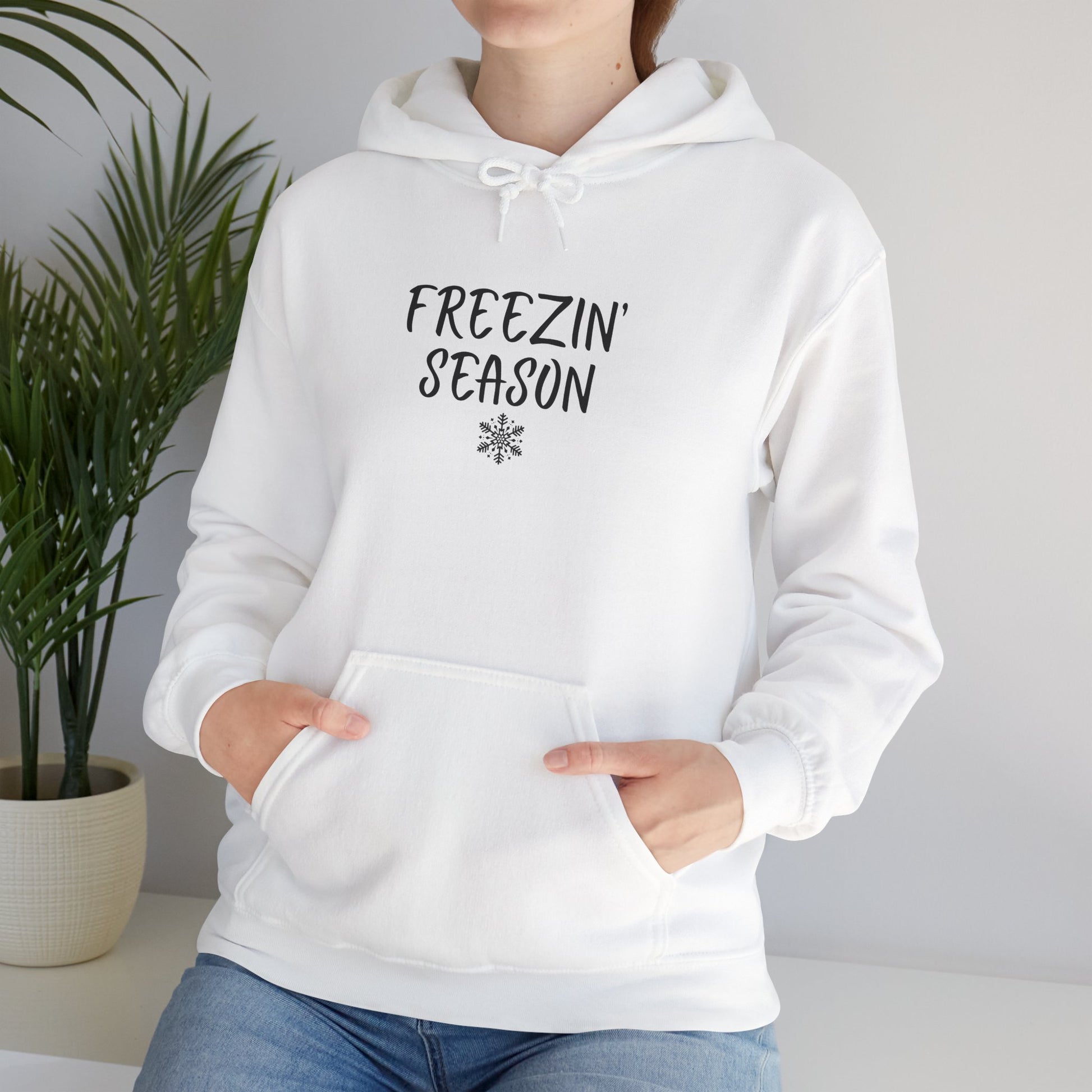 Bundle up in style with our Freezin’ Season Hoodie. Featuring bold black lettering and a delicate snowflake beneath, this crisp white hoodie is a cozy must-have for winter days and holiday nights. Simple, stylish, and effortlessly festive, it’s the perfect addition to your winter and Christmas collection.