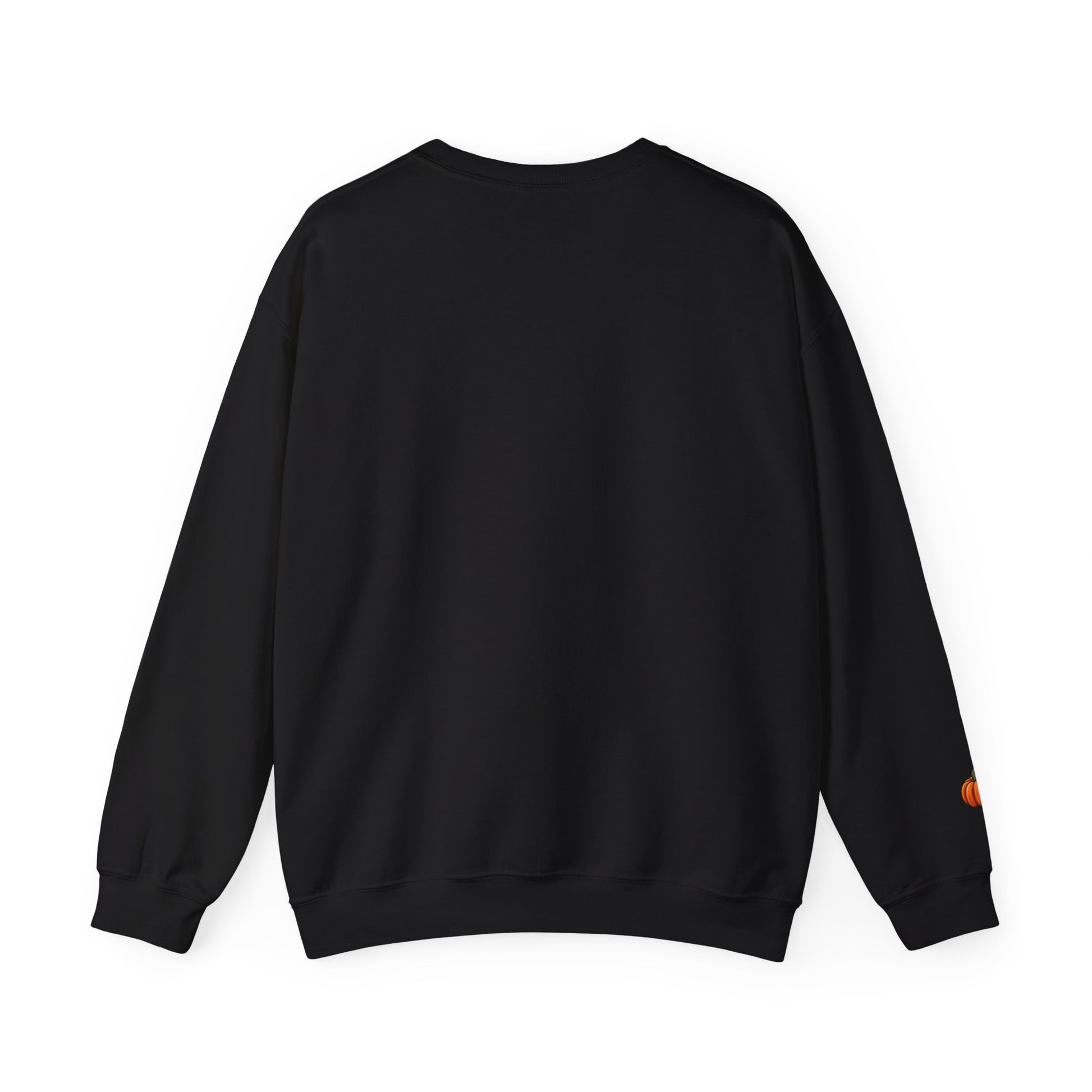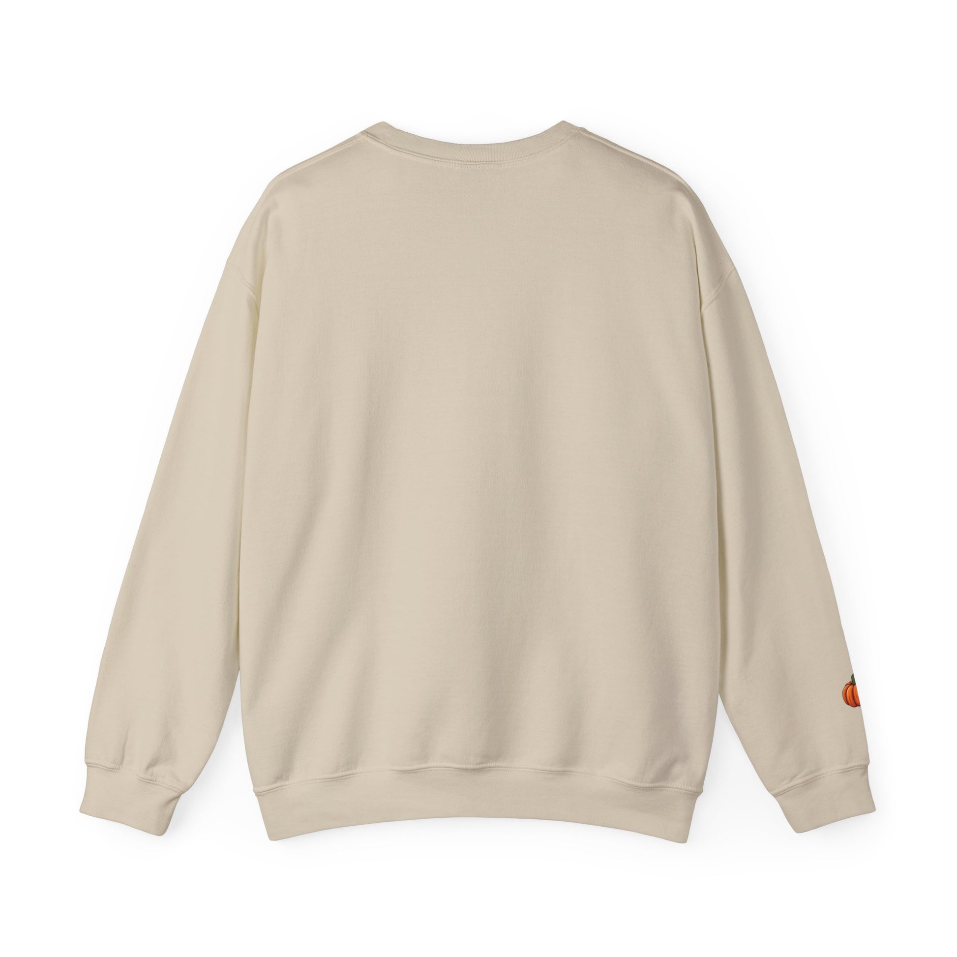 This fun, festive design captures all the favorites of the season — a golden pumpkin, a slice of pie, warm drinks, and a turkey ready for the feast — surrounded by autumn leaves and cheerful fall tones. A pumpkin accent sleeve adds a playful seasonal touch that makes this sweatshirt a customer favorite.