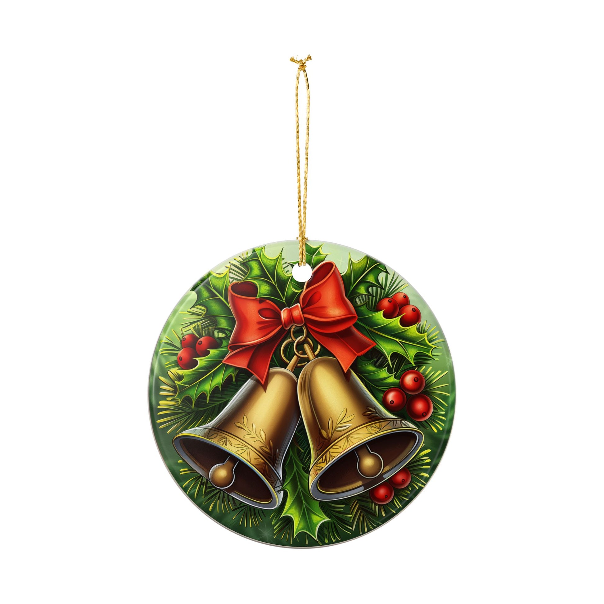 Celebrate the joyful sound of Christmas with our Golden Bells ornament — a timeless design featuring two radiant brass bells tied with a red satin bow and surrounded by festive holly and berries. This vintage-inspired piece shines with warmth and tradition, bringing a touch of classic elegance to your tree.