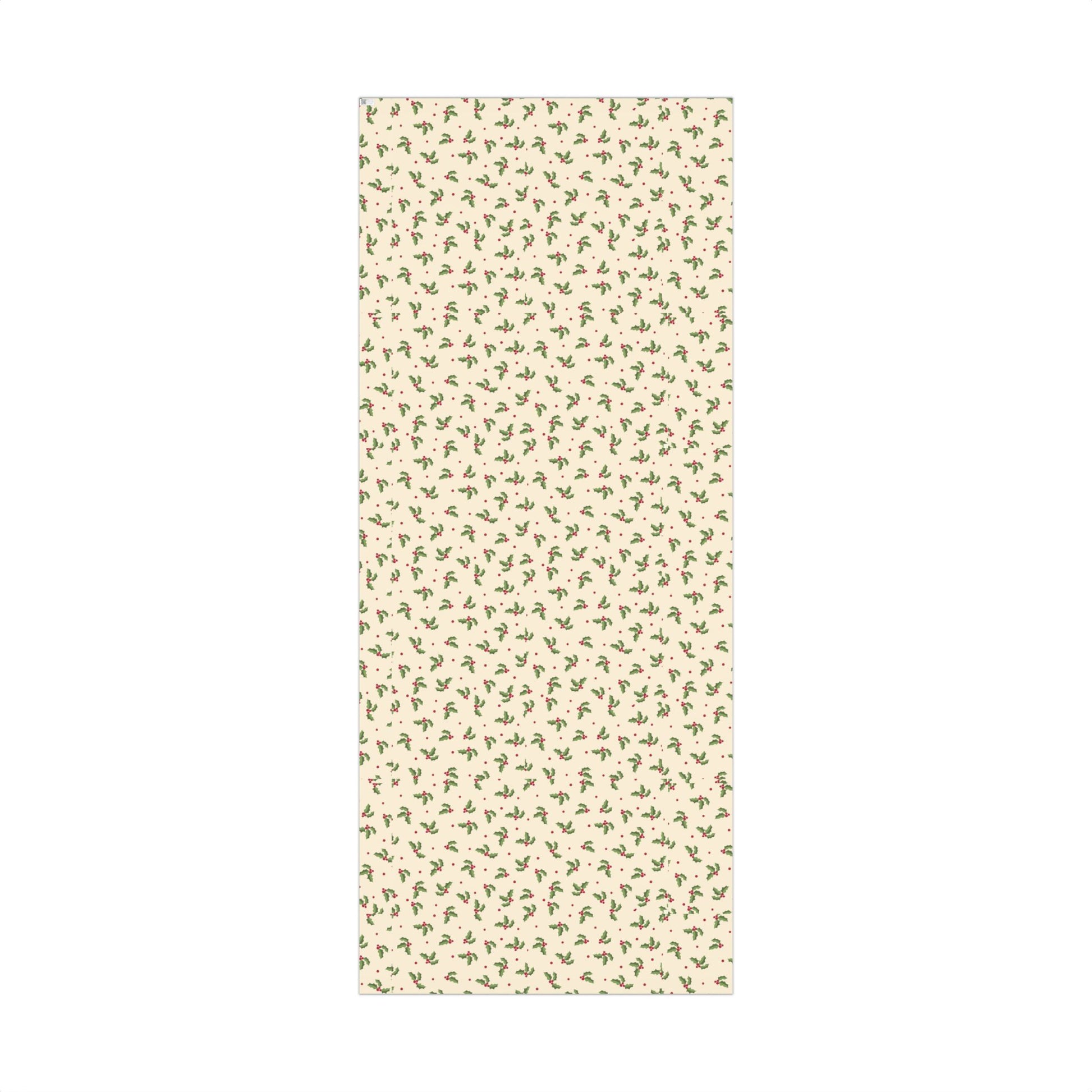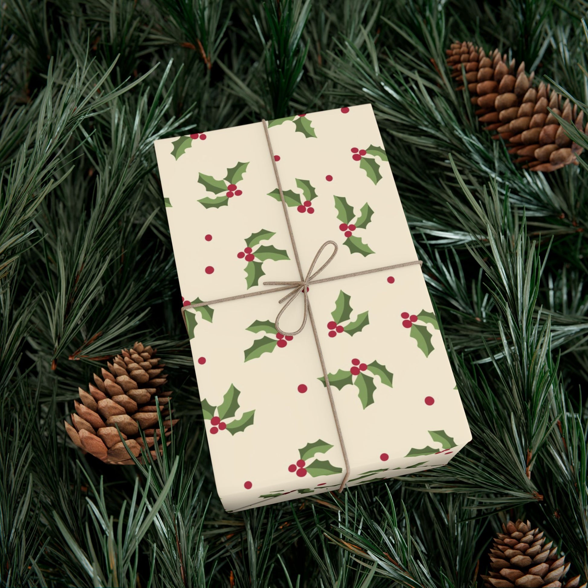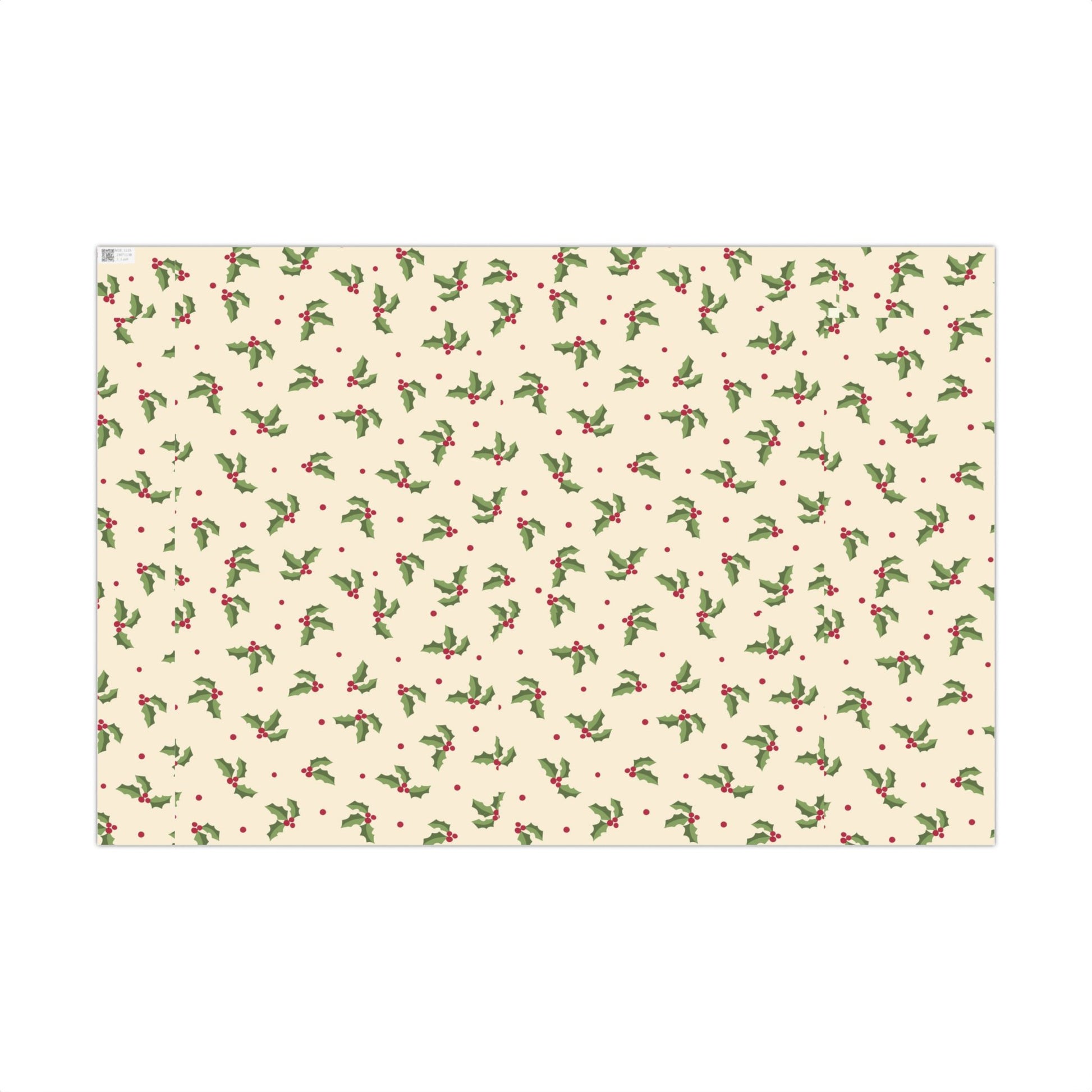 Creamy, vintage-inspired holly wrapping paper that brings a quiet, nostalgic charm to seasonal gifting. Tiny sprigs of green holly and bright red berries dance across a warm ivory background, creating a soft, cottagey look that layers beautifully under twine, kraft tags, or metallic ribbon. The finish options — satin for a gentle sheen or matte for a muted, artisanal feel — let you tune the mood from cozy to refined. Durable and flexible, the paper holds neat folds without cracking and stands up to light handling and brief contact with moisture. Because it’s printed with water-based, Greenguard-certified inks on fully recyclable paper, you can wrap thoughtfully and responsibly. Use it to create understated holiday packages, elegant hostess gifts, or stacked mantel displays that feel handmade and heartfelt.