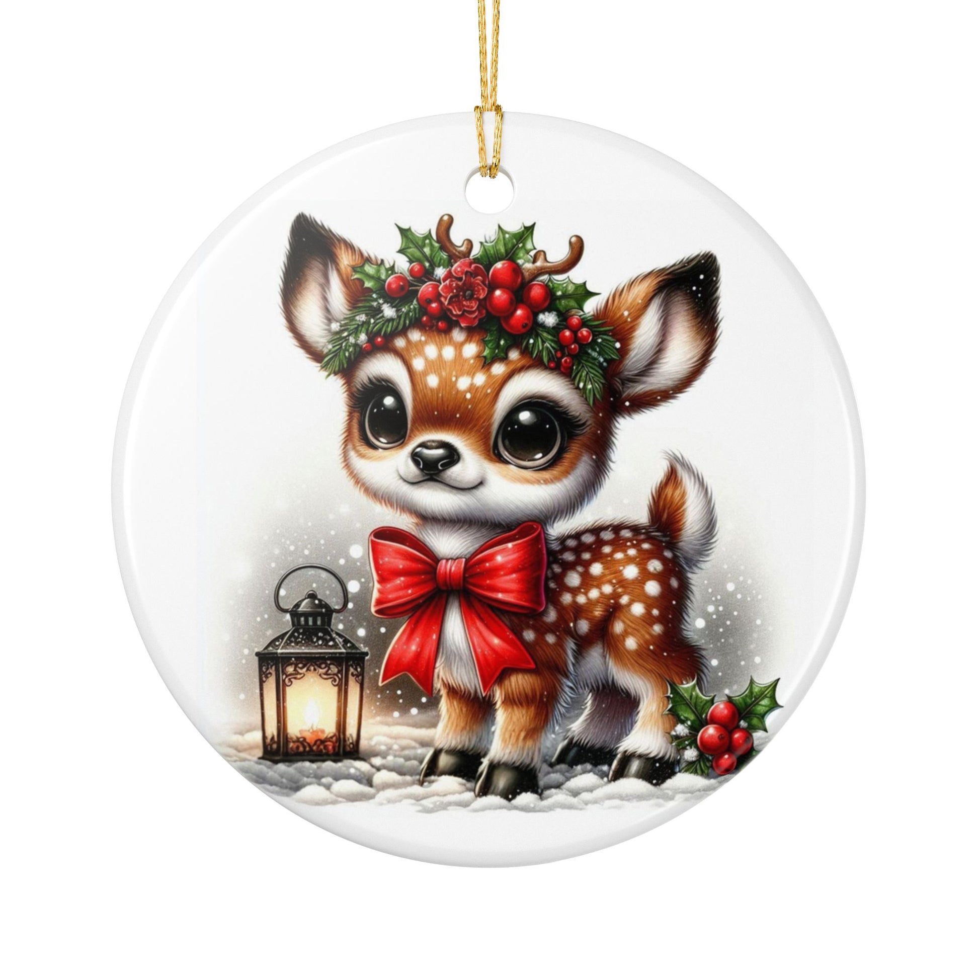 Let the gentle spirit of the forest brighten your Christmas tree with Hollyberry Fawn. This sweet baby deer, crowned in holly and berries and standing beside a glowing lantern, brings a heartwarming touch of woodland wonder to the season. With its big bright eyes and snowy setting, this double-sided ceramic ornament captures the innocence and joy of Christmas through a child’s eyes.