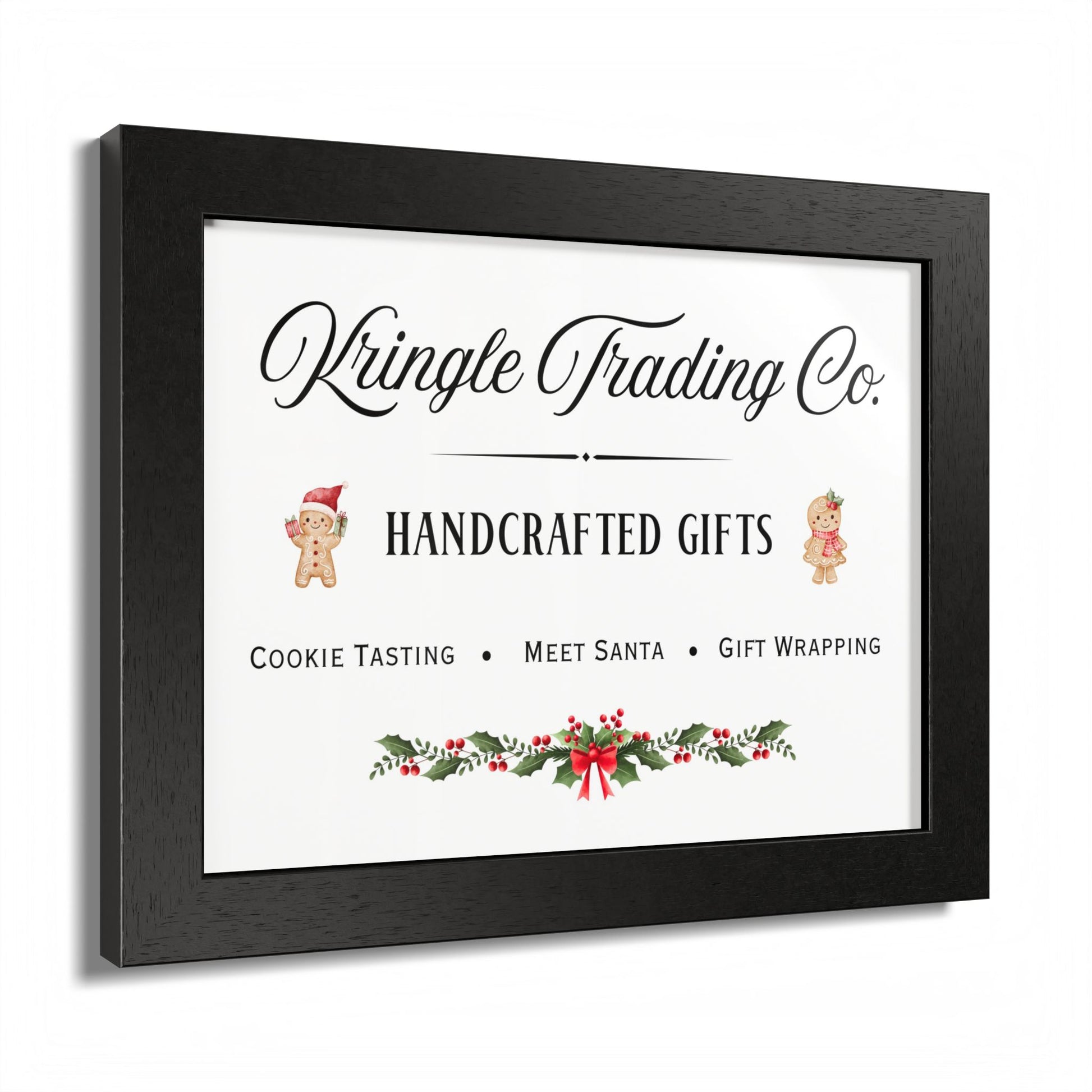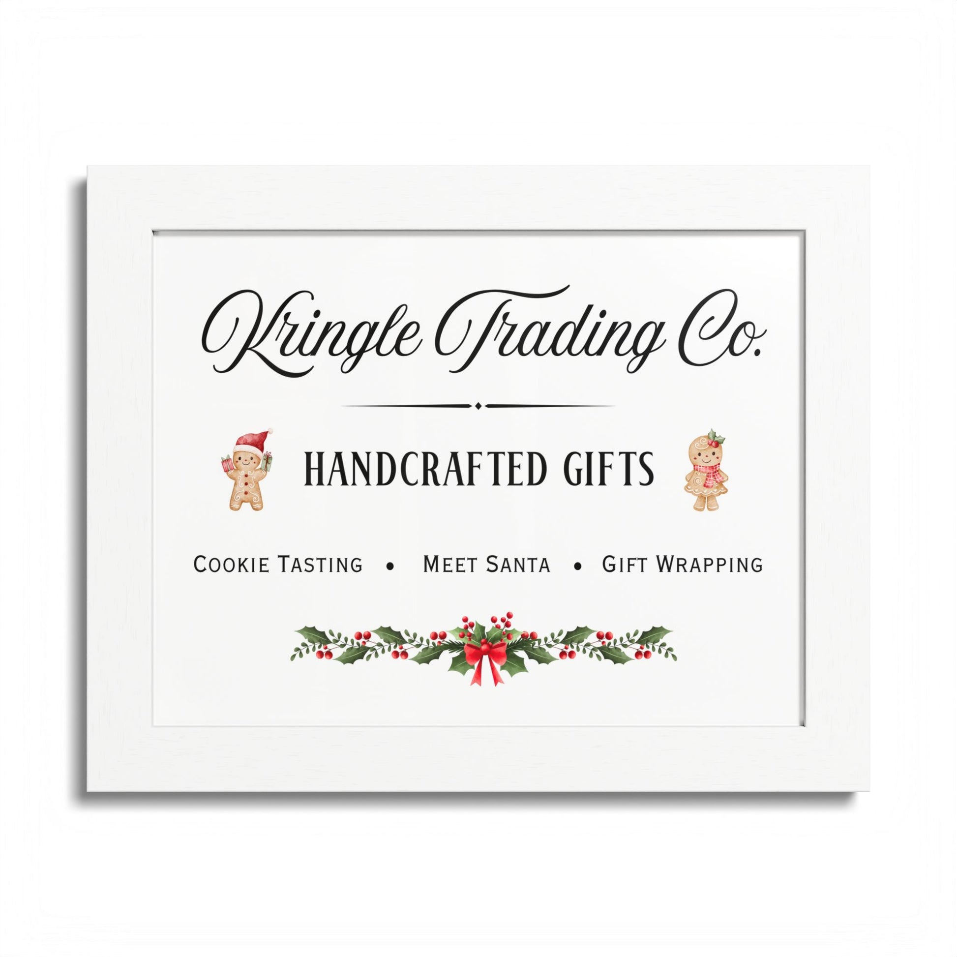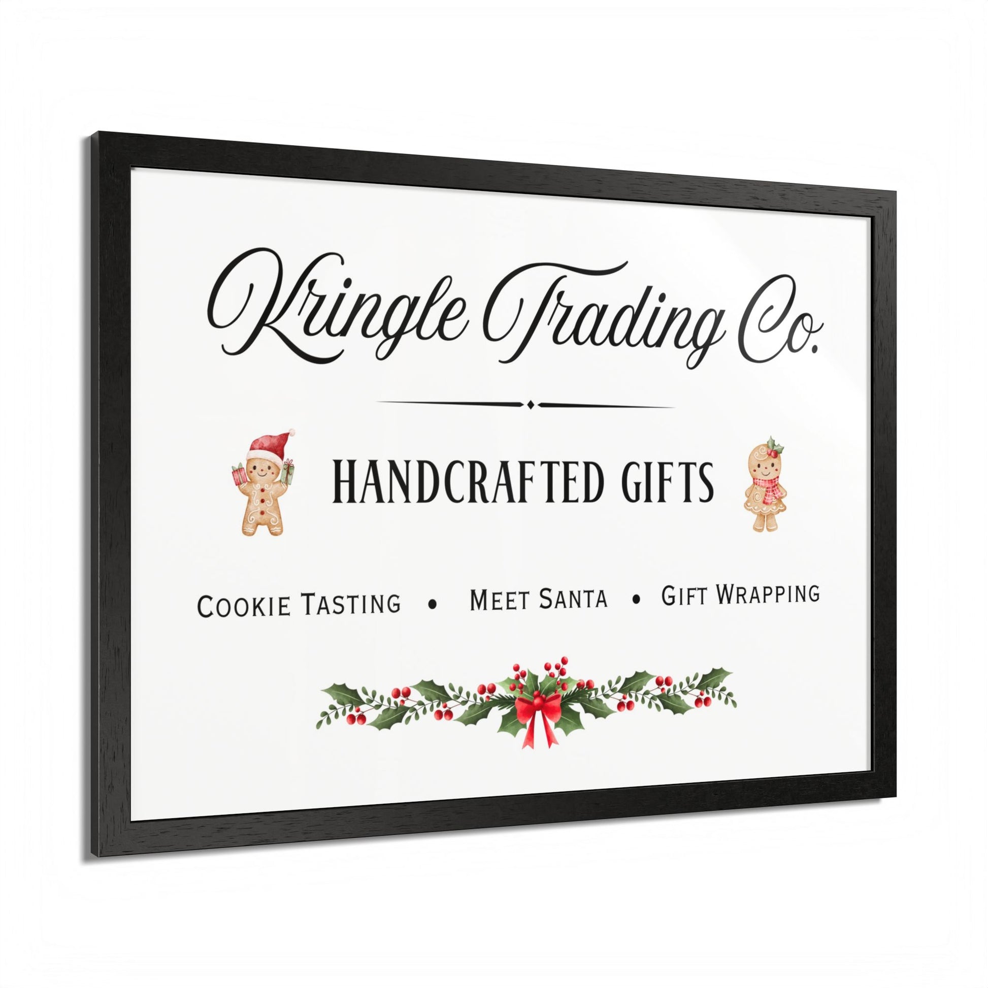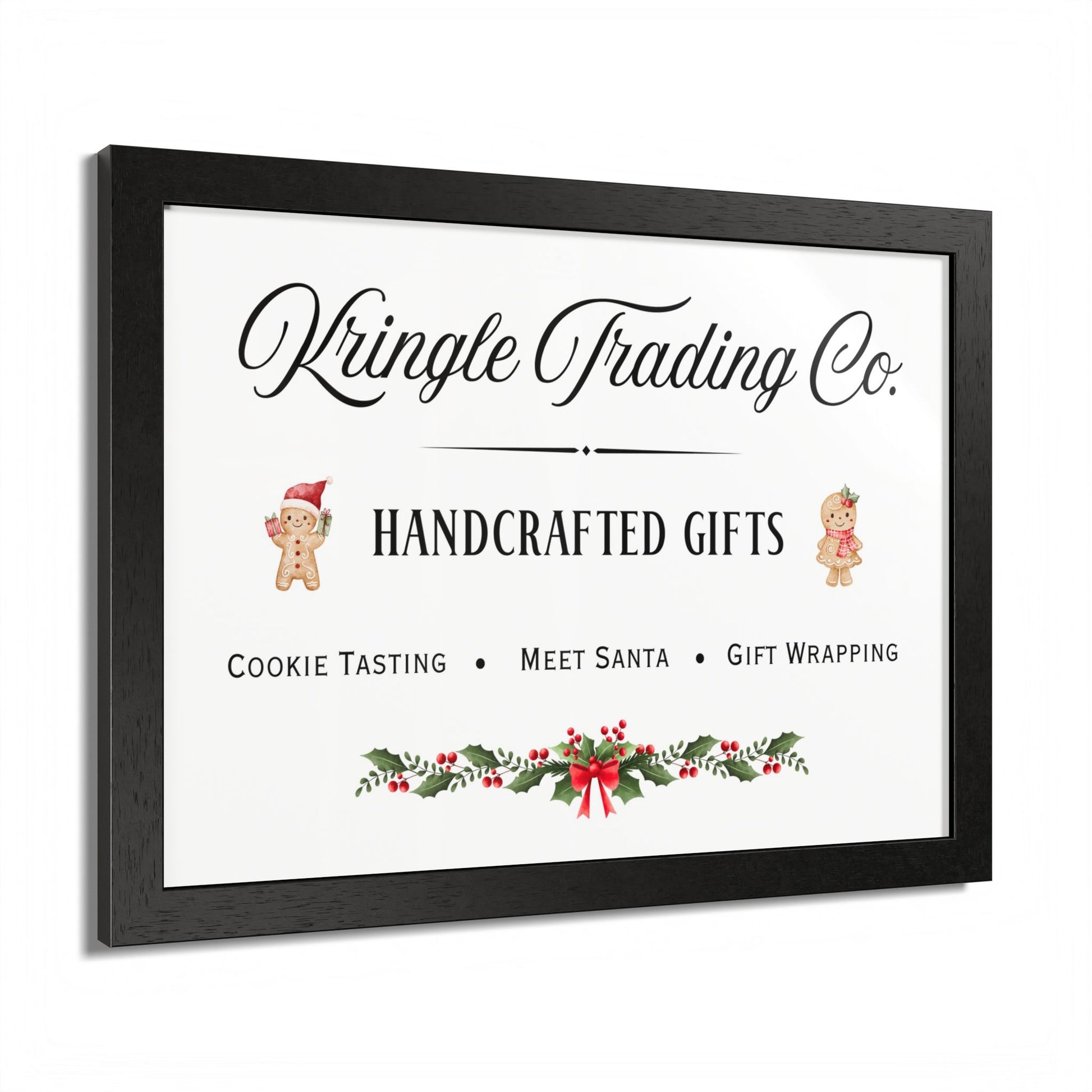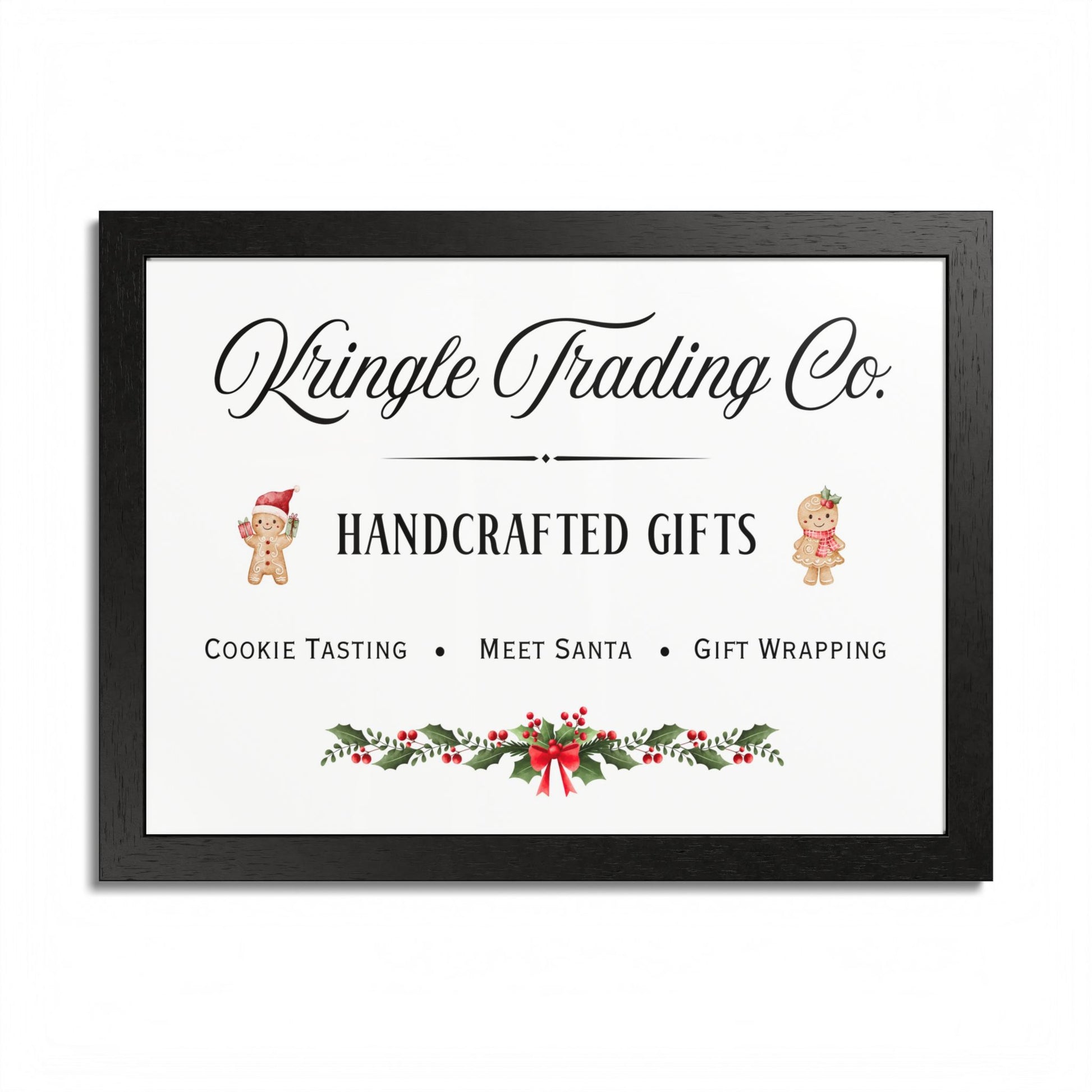 Step into the heart of holiday cheer with our Kringle Trading Co. wall art—a charming tribute to classic Christmas markets and old-fashioned handcrafted gifts. This delightful print captures the nostalgic spirit of the season with playful gingerbread characters, festive holly accents, and elegant typography that feels straight from Santa’s workshop.