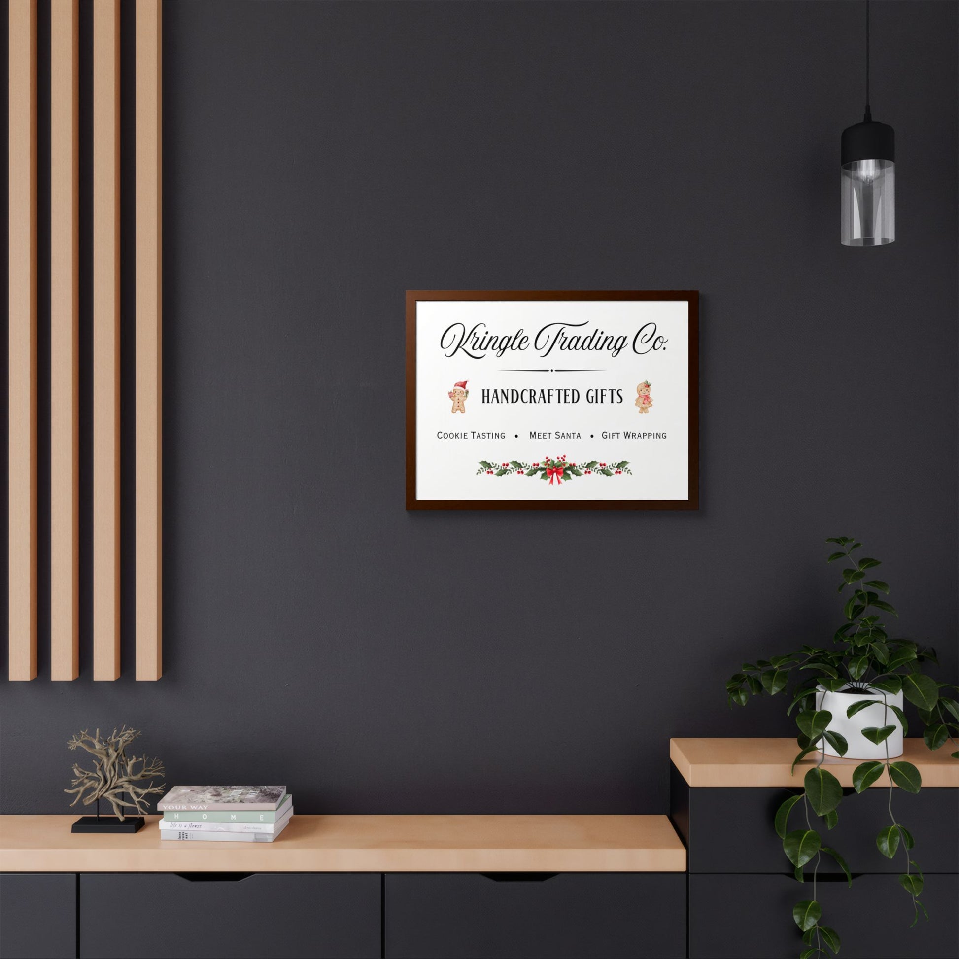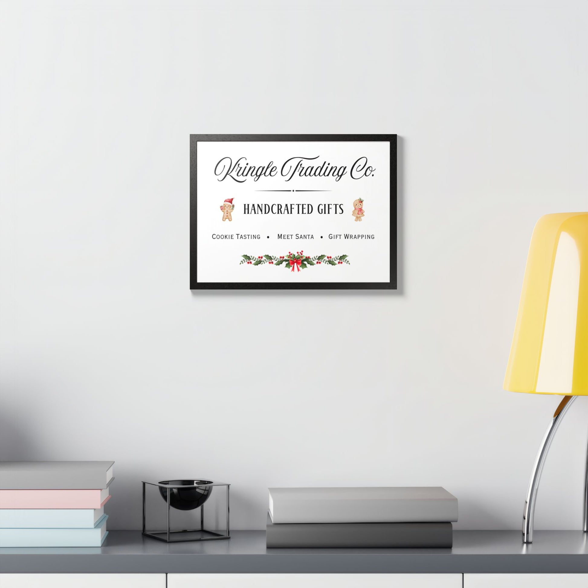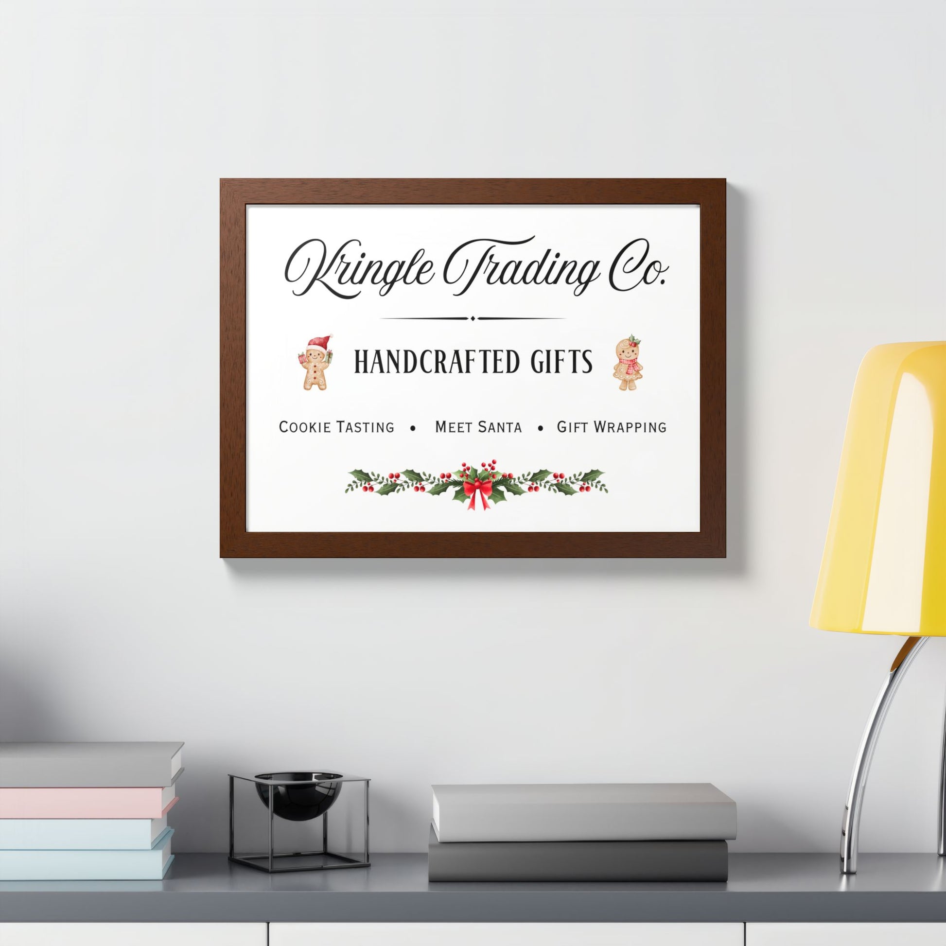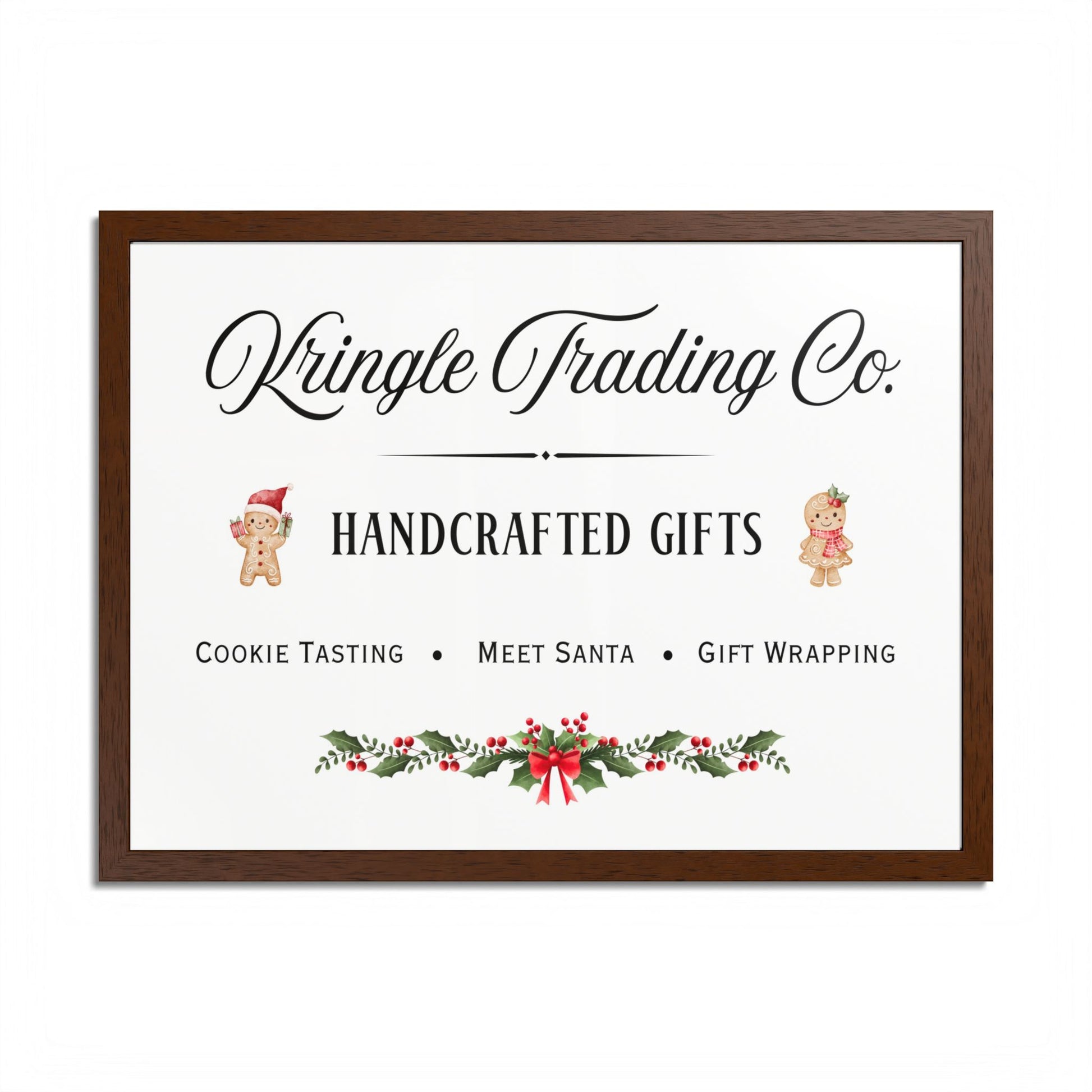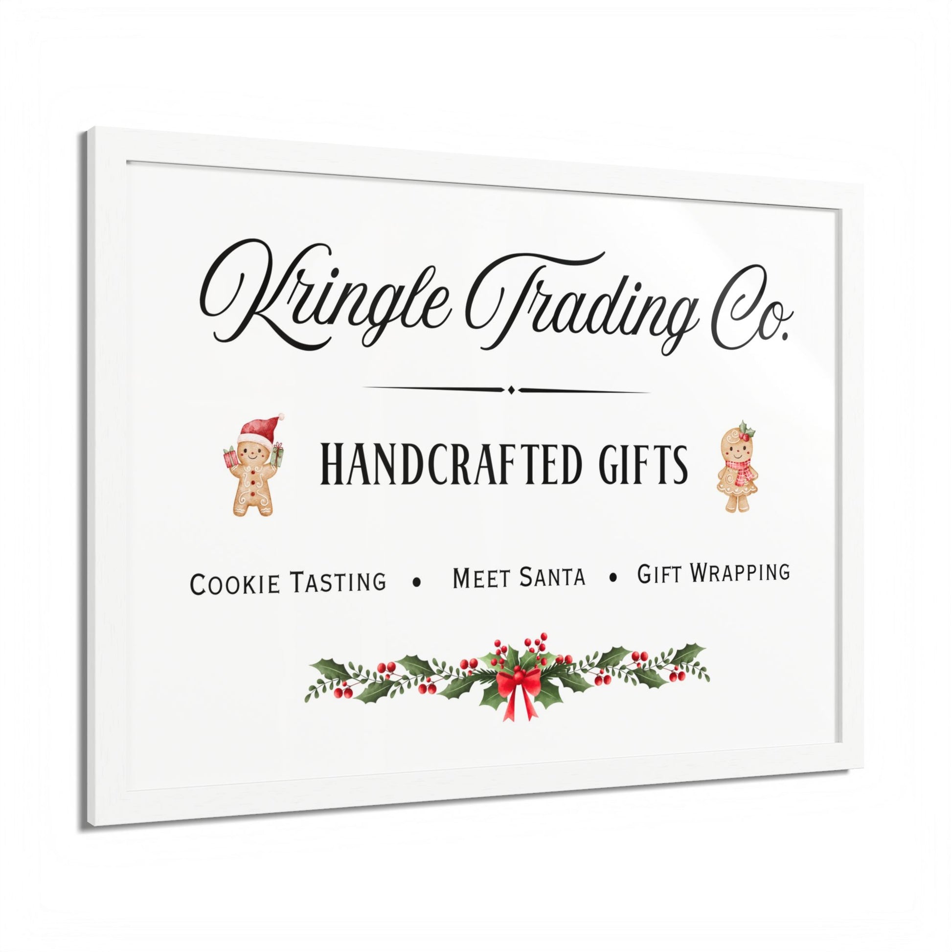 Step into the heart of holiday cheer with our Kringle Trading Co. wall art—a charming tribute to classic Christmas markets and old-fashioned handcrafted gifts. This delightful print captures the nostalgic spirit of the season with playful gingerbread characters, festive holly accents, and elegant typography that feels straight from Santa’s workshop.