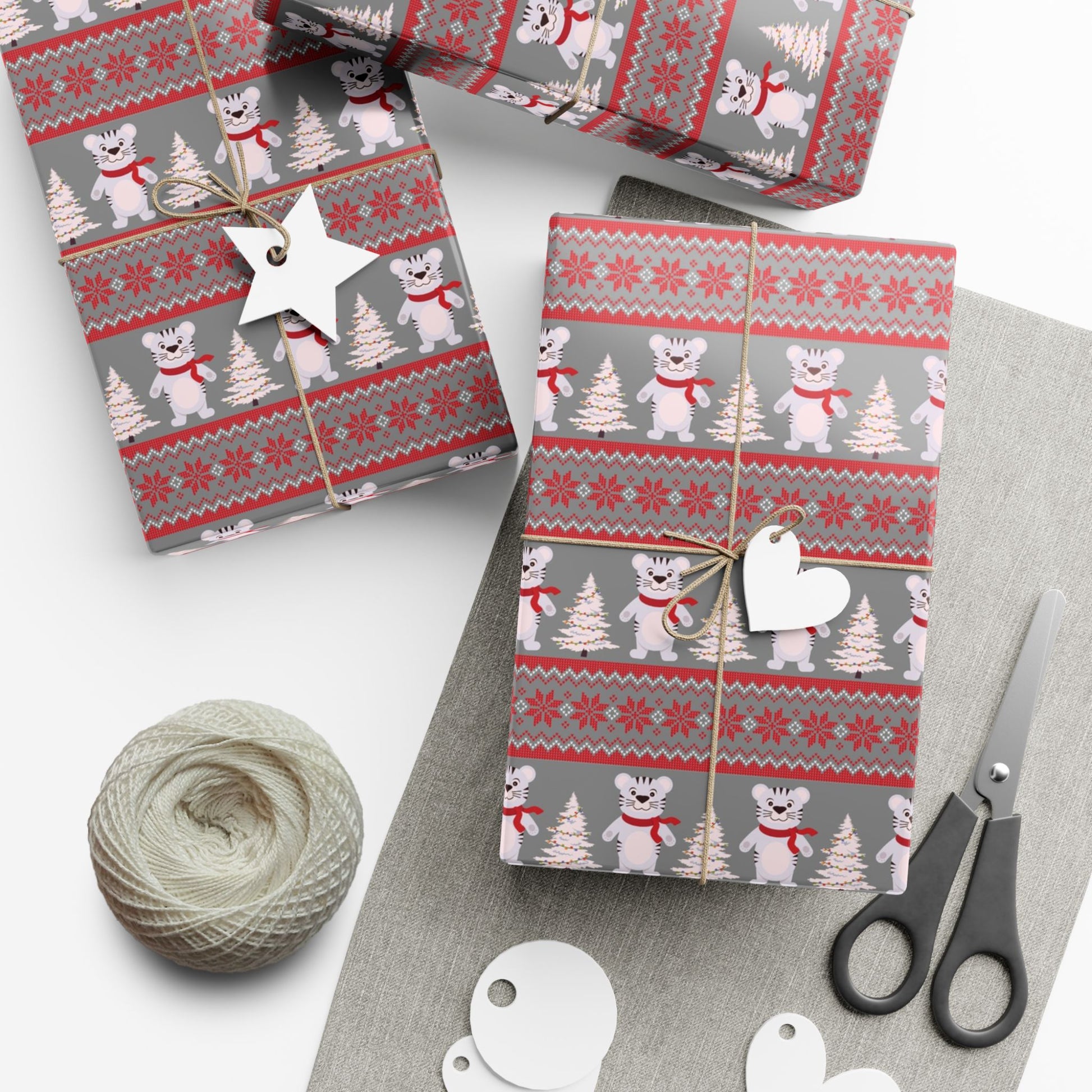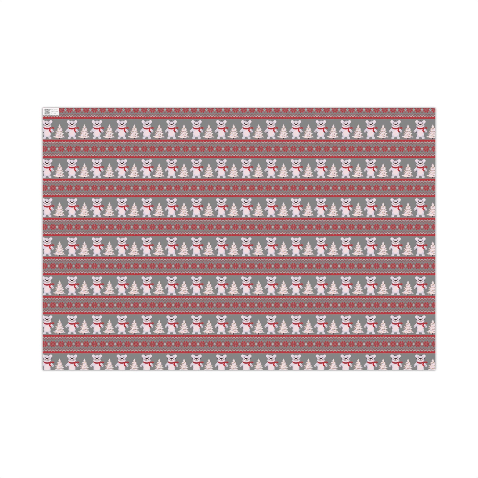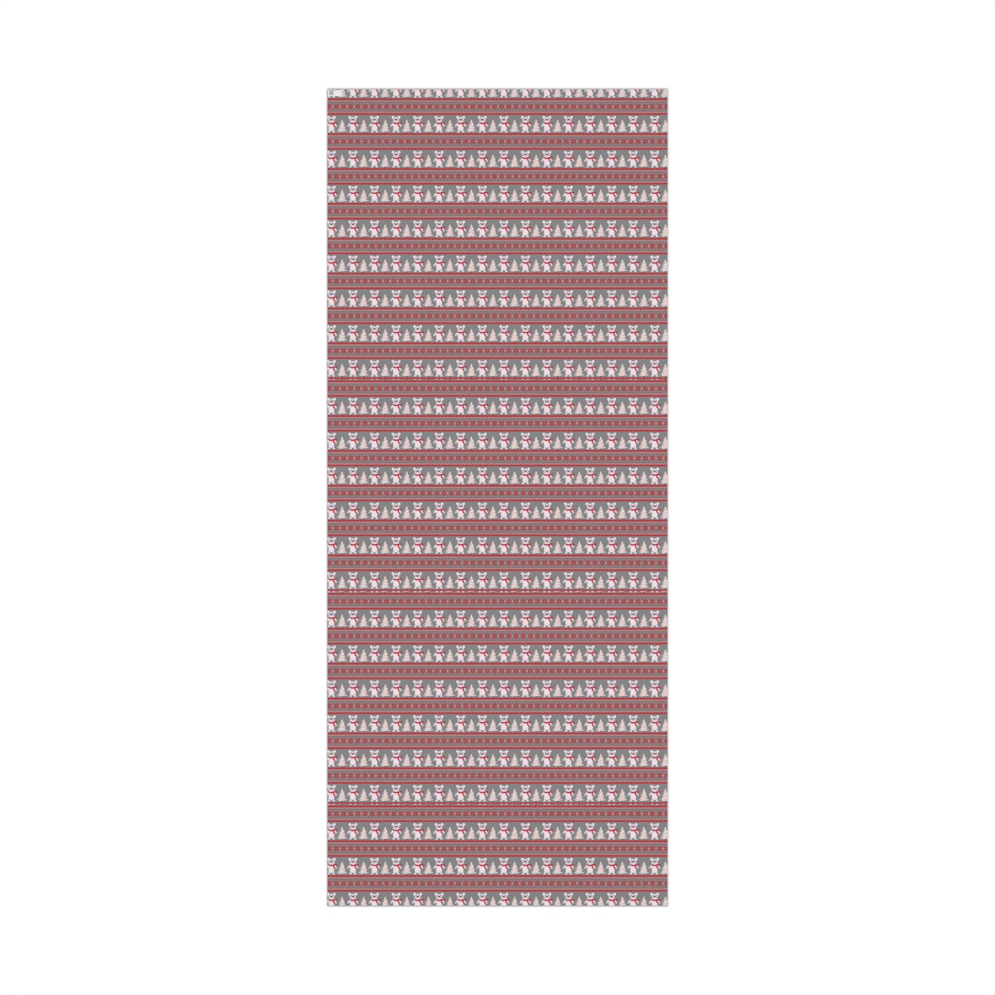 Soft gray paper patterned with playful polar bears, tiny fir trees, and cozy Nordic stripes. The design leans warm and whimsical—red scarves on bears, delicate snowflake motifs, and alternating bands that feel like a knitted sweater. It wraps like a quiet winter morning: familiar, cheerful, and ready to dress a thoughtful present for friends and family. The durable, flexible paper holds crisp folds and clean edges, while the choice of satin or matte finish lets you dial the look from gently glowing to understated. Use it when you want a wrapped gift that reads homey and handcrafted without extra fuss—holiday parcels, seasonal swap packages, or a slow gift exchanged by the fireside.