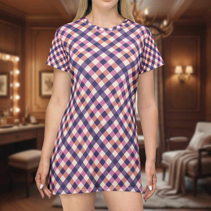 Plaid T-Shirt Dress — Pink & Purple Checked All-Over Print