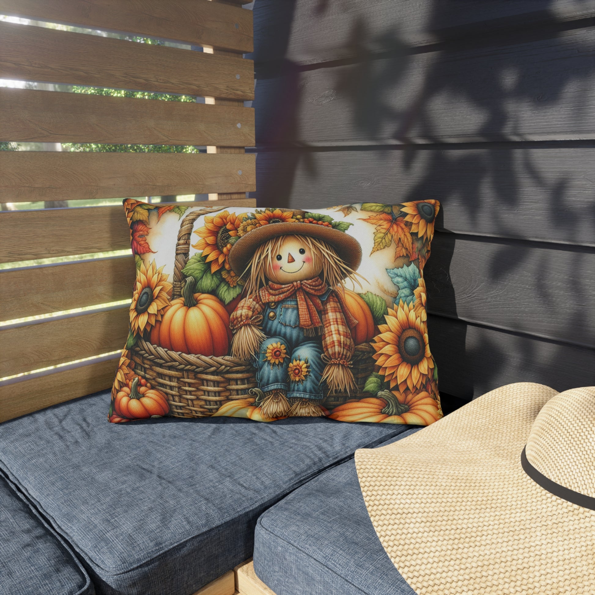 Bring a little country sunshine to your porch or patio with our Sunflower Scarecrow Outdoor Pillow. This charming design features a smiling scarecrow dressed in denim and plaid, surrounded by golden sunflowers, bright pumpkins, and colorful autumn leaves—the very picture of harvest season happiness.