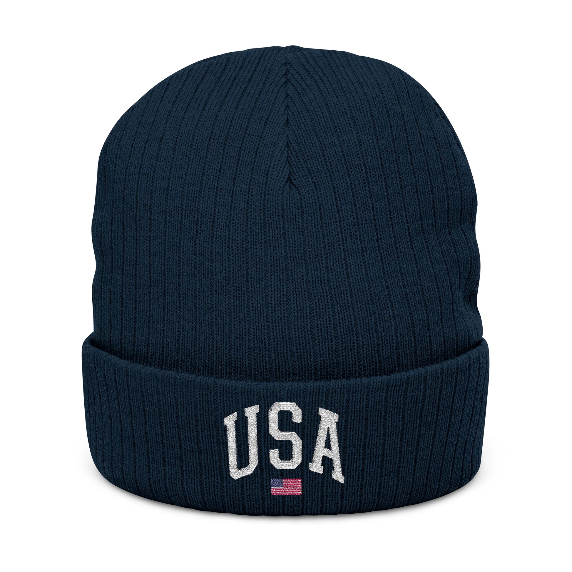 USA Embroidered Knit Beanie – American Flag Cuffed Winter Stocking Cap