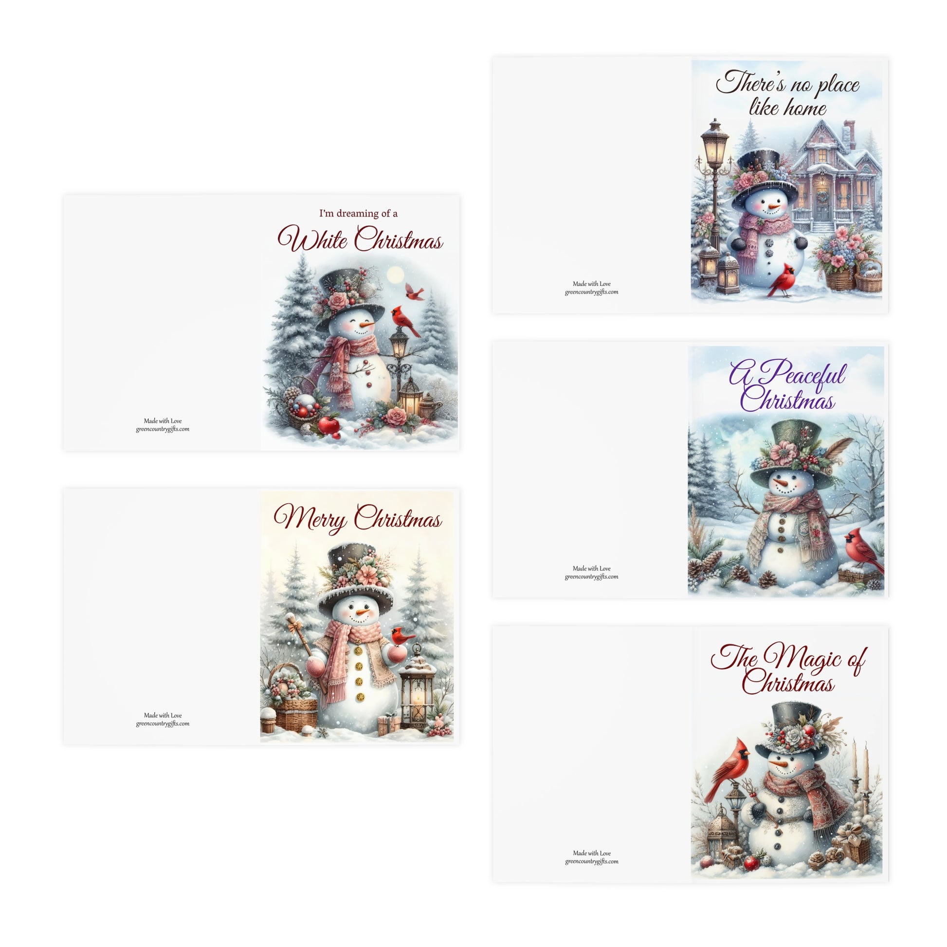 Capture the timeless beauty of Christmas with this enchanting five-card collection featuring softly painted Victorian snowmen surrounded by candlelight, evergreens, and winter’s gentle glow.