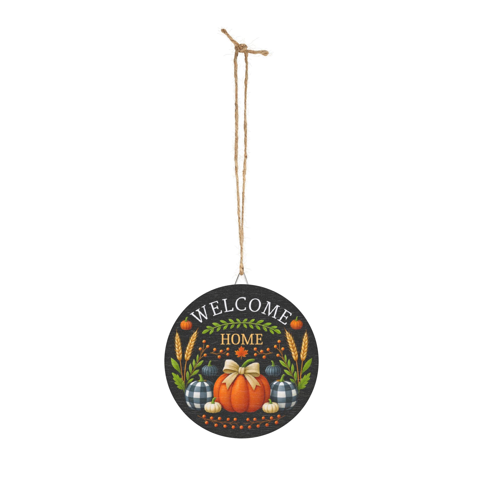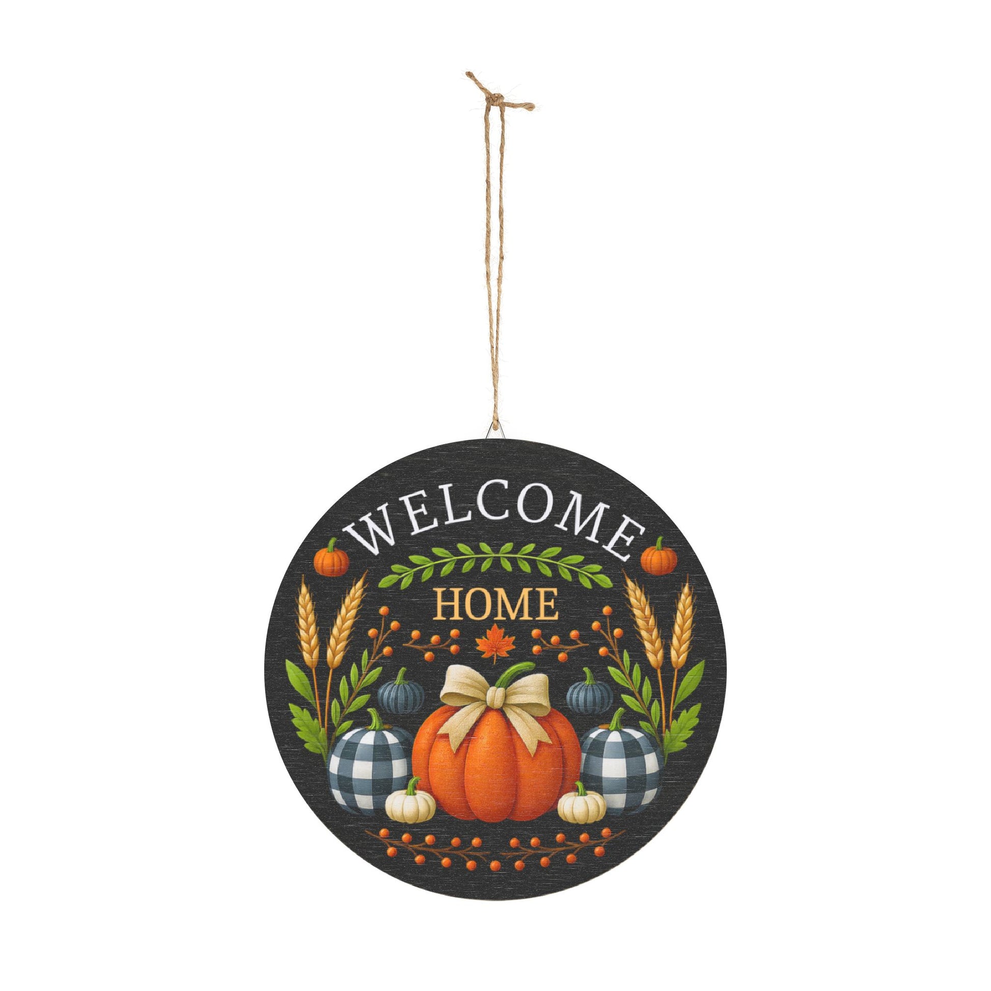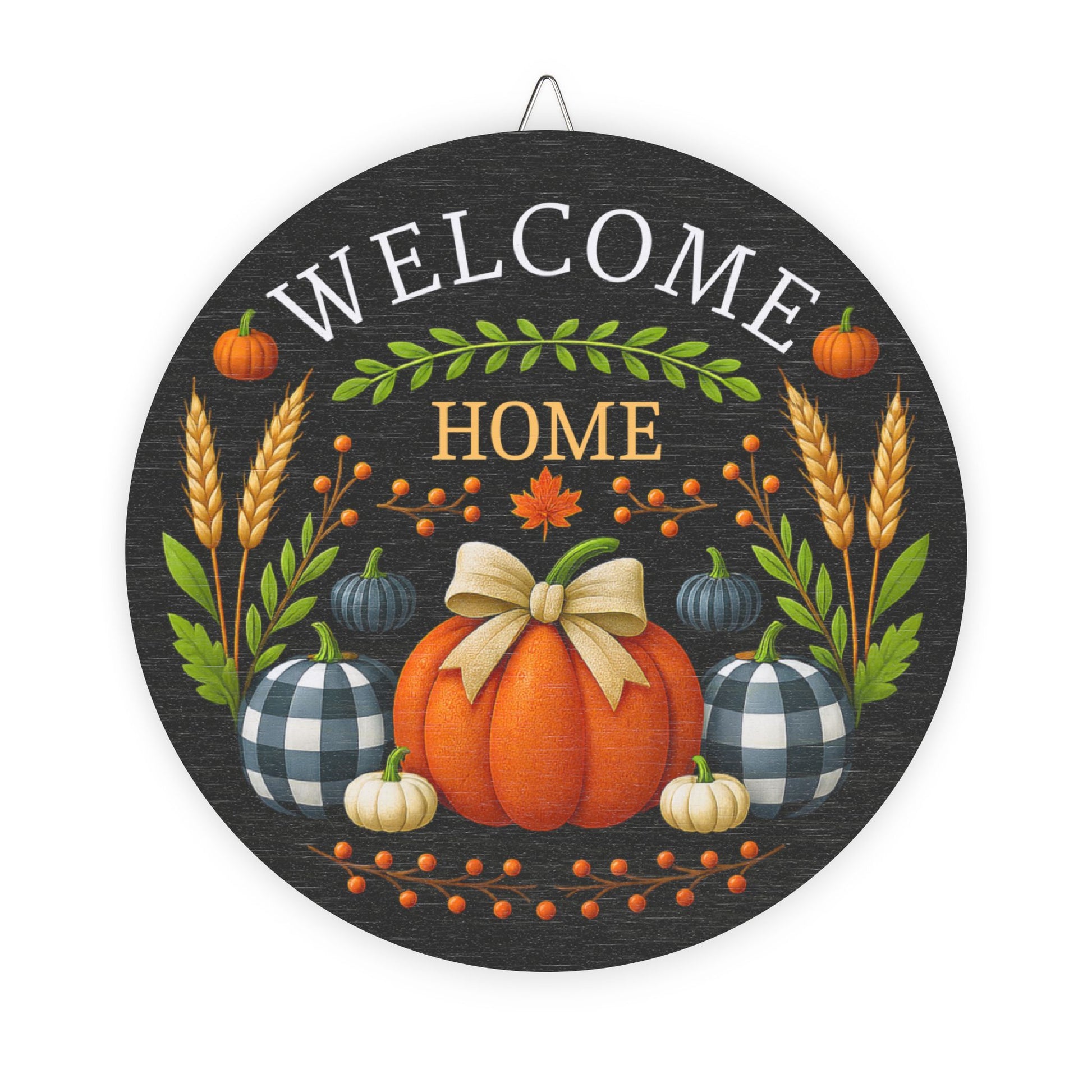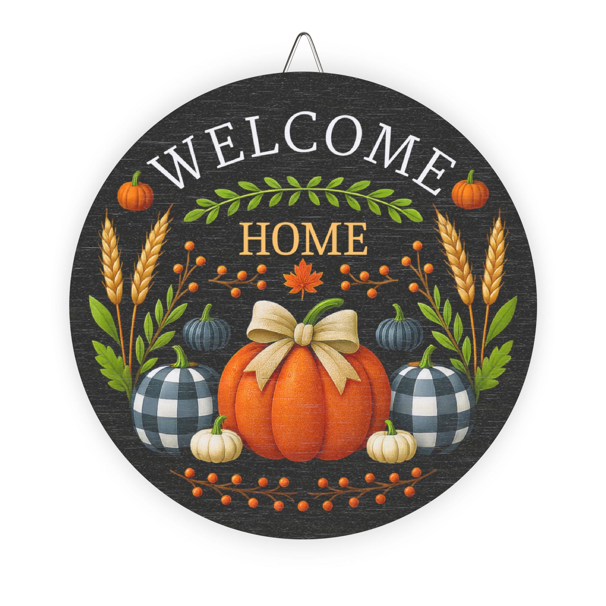 Bring the heart of autumn to your doorstep with this beautifully crafted “Welcome Home” Wooden Sign. Designed with love and seasonal charm, it features a smooth-textured orange pumpkin tied with a soft beige bow, surrounded by buffalo-check pumpkins, golden wheat, and harvest berries—all set against a deep charcoal backdrop and framed by rustic wood.