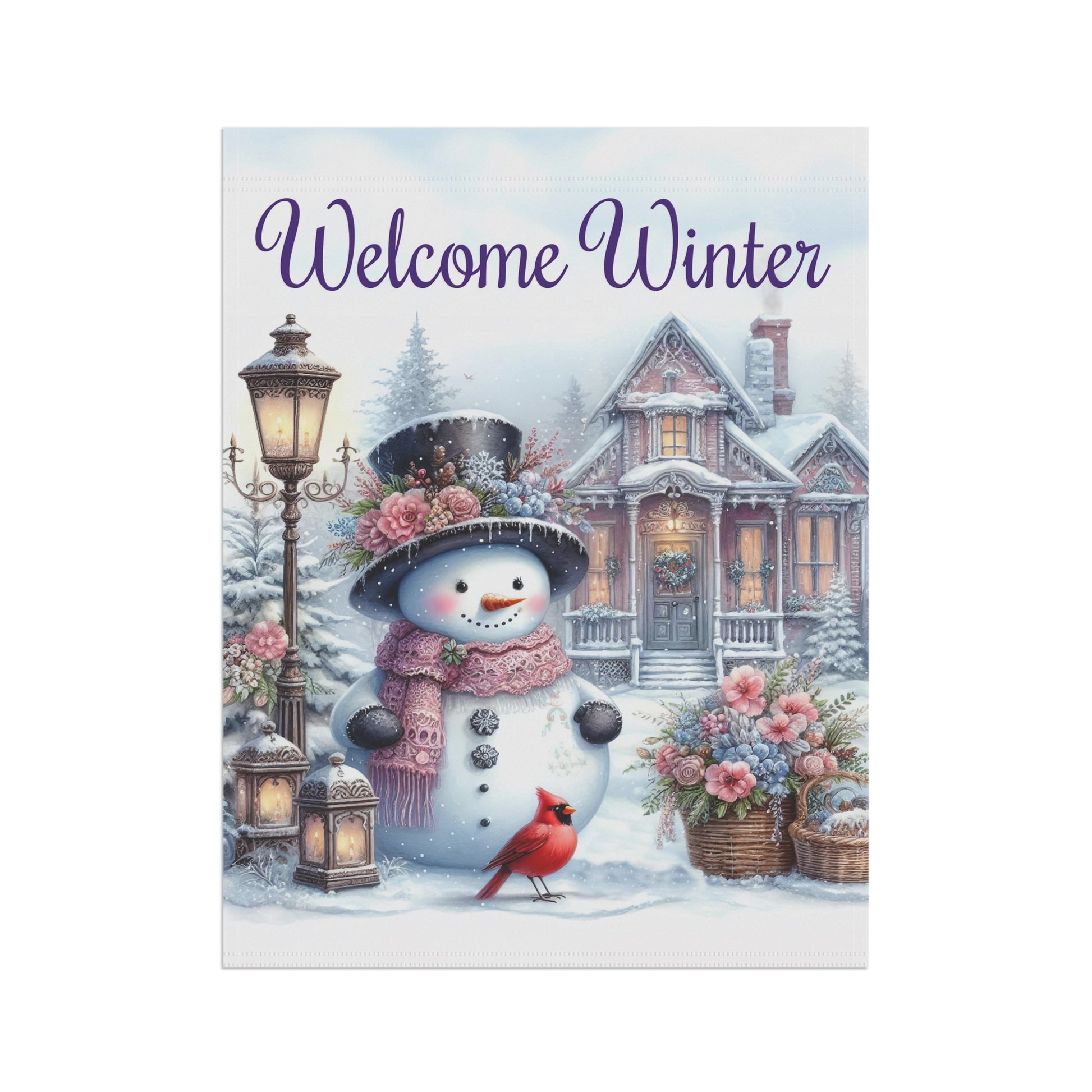 Bring quiet beauty to your porch or garden this season with our Welcome Winter Garden Flag. Featuring a charming snowman in a flower-trimmed hat, a bright red cardinal, and a softly glowing home in the distance, this piece captures the peaceful magic of a winter’s day.